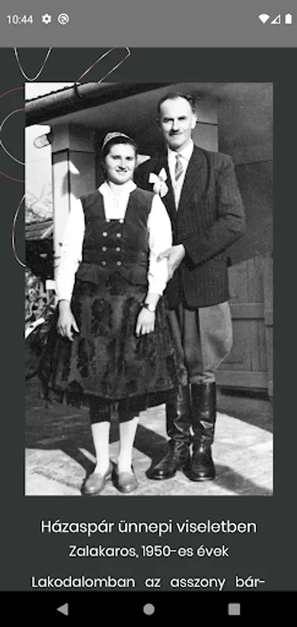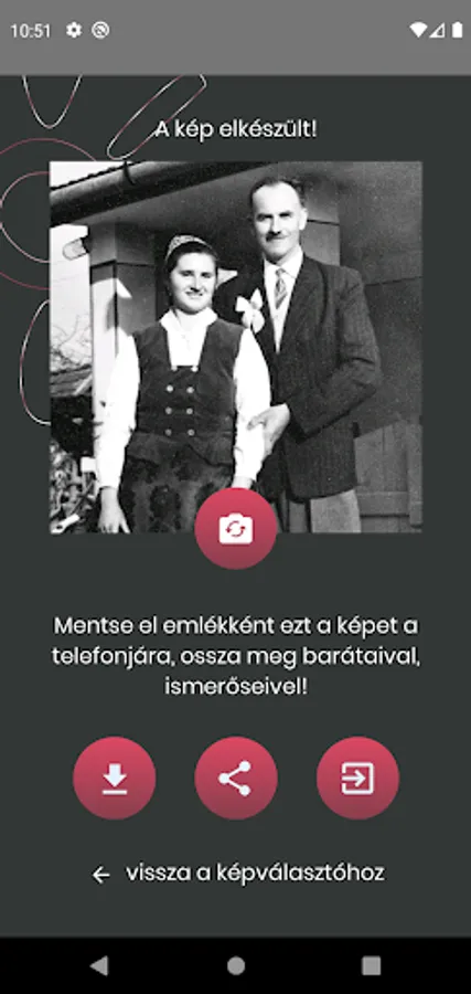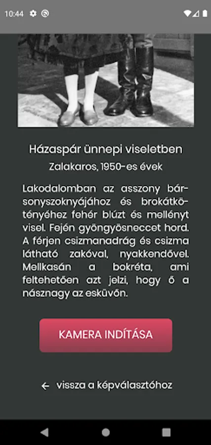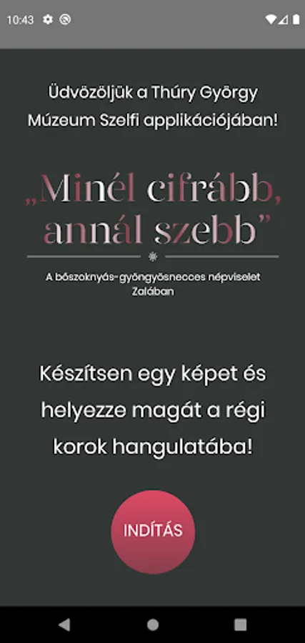 The Selfie application complements the ethnographic exhibition of the Thúry György Museum in Nagykanizsa entitled "The more digital, the more beautiful..." - The folk costume with loose skirts and pearl nets in Zala as an interactive tool. The selfie is virtually related to the theme of the exhibition and dresses the user in the folk costume of the time, thus helping the historical time travel in a playful way. The completed picture is a montage of the user's face into a picture of contemporary life, a person dressed in typical folk costume.