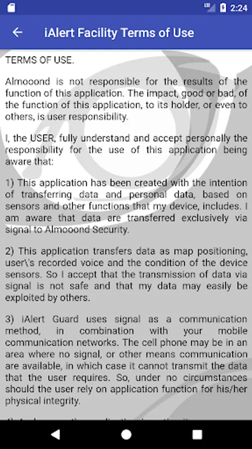 iAlert Facility use location services in the background so as to track your position and send these data to a Security Operation Center (S.O.C.) The aim of this action is the immediate response, by the SOC team for your safety and only. When the option is enabled, the iAlert Facility app can track the location