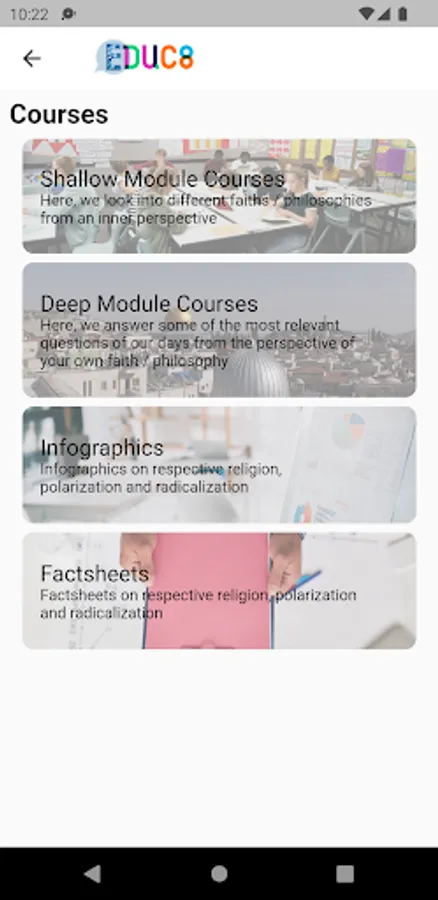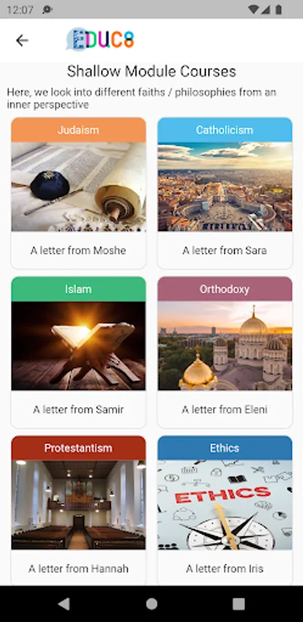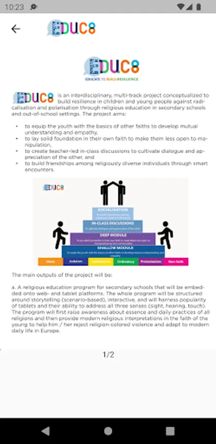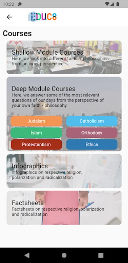 EDUC8 is a free app that helps to build resilience against radicalisation and polarisation through religious education. Forming an outcome of the EDUC8 Project which is funded by the EU, EDUC8 App offers a selection of courses for secondary school teachers and students. The content is in English, French and Dutch for the followers of six faiths / life philosophies, namely Judaism, Catholicism, Islam, Orthodoxy and Protestantism, and non-confessional ethics.