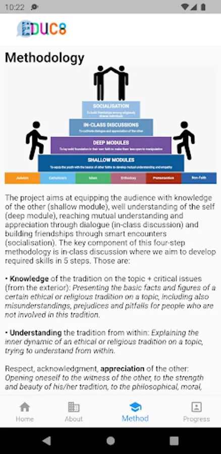 EDUC8 methodology aims at equipping the audience with knowledge of the other (shallow module), well understanding of the self (deep module), reaching mutual understanding and appreciation through dialogue (in-class discussion) and building friendships through smart encounters (socialisation). The content in the app is designed in a way to support implementation of this methodology.