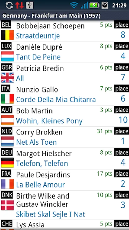 With this application you can browse the list of the songs that have participated to the Euro Vision festival from 1956 to present. If you click on a song, the application will attempt to find it for you on youtube (this feature works only if you have an active internet connection) .