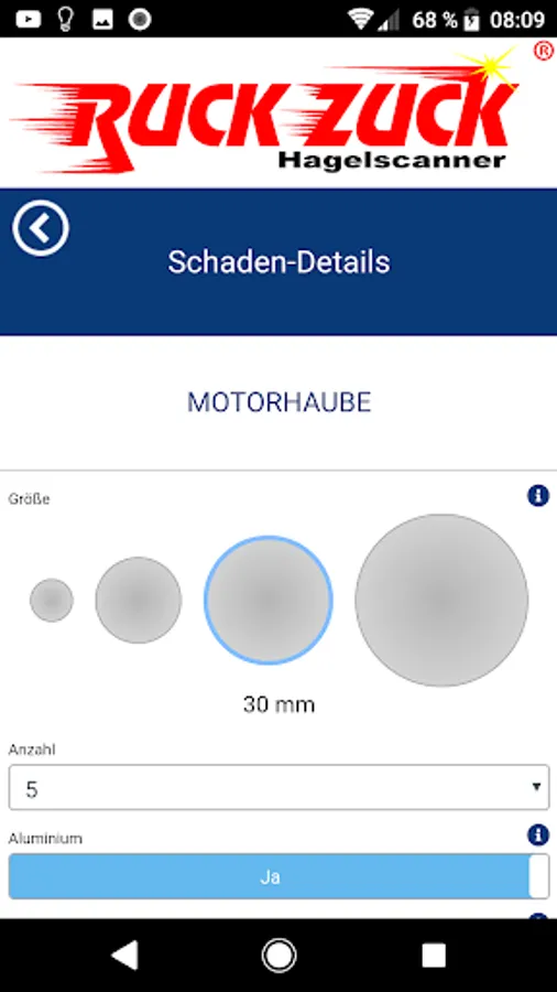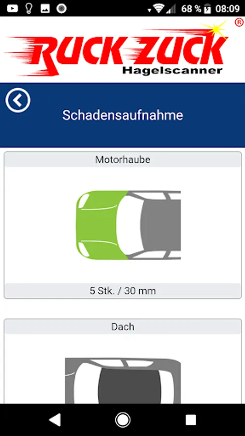 With the help of a guide, you can find out everything you need to consider during the damage assessment. The damage assessment itself takes place via an intuitive selection of the vehicle components. The size (10mm to 80mm) and number of dents can be specified for each component. In addition, all recorded data can be documented in detail with photos.