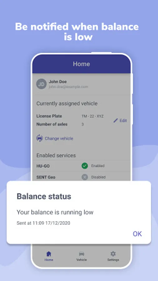 • be notified when HU-GO account is low on credit