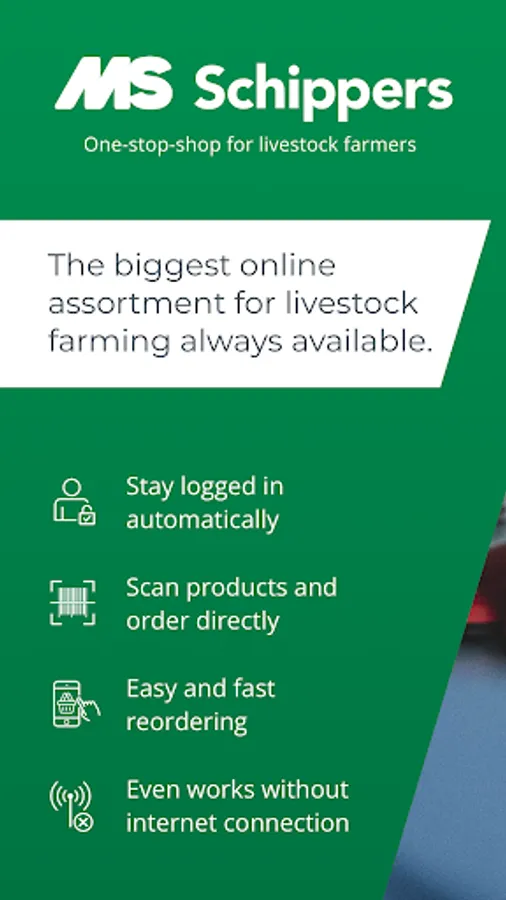 As a farmer, your days are busy. To make ordering products super easy for you, we have developed the MS Schippers app. An easy ordering app with a complete assortment for pigs, cattle, poultry, sheep and goats.