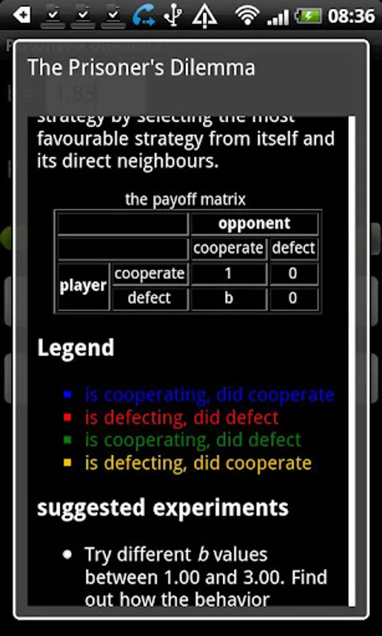 The spatial variant of the iterated prisoner's dilemma is a simple yet powerful model for the problem of cooperation versus conflict in groups. The app demonstrates the spread of 'altruism' and 'exploitation for personal gain' in an interacting population of individuals learning from each other by experience.