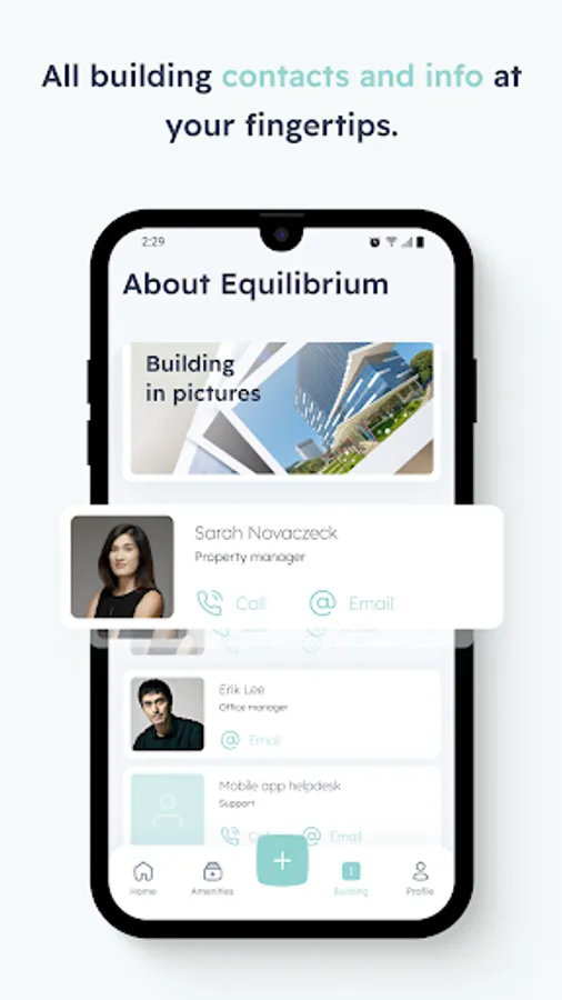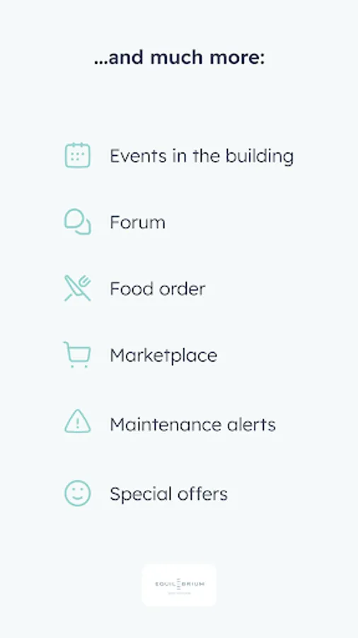 This application is intended for employees that work in Equilibrium in Bucharest and their visitors. Important information about the building can be found on the dashboard, which dynamically changes throughout the day. The app allows employees frictionless access into the property and will enable them to invite guests to the property as well. Additional modules are available including, amenity reservations, events, community information, etc.