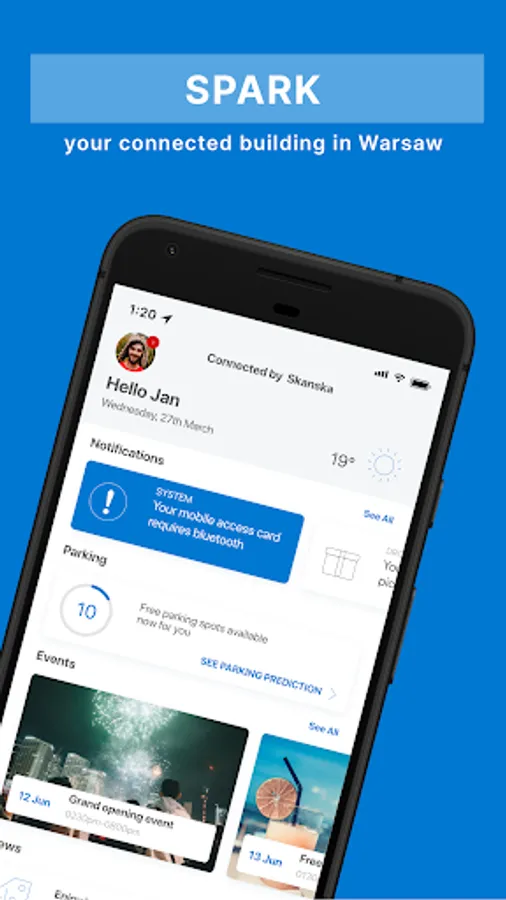 Spark app is a community application with integrated building services such as access and parking for the Spark project in Warsaw. Poland.