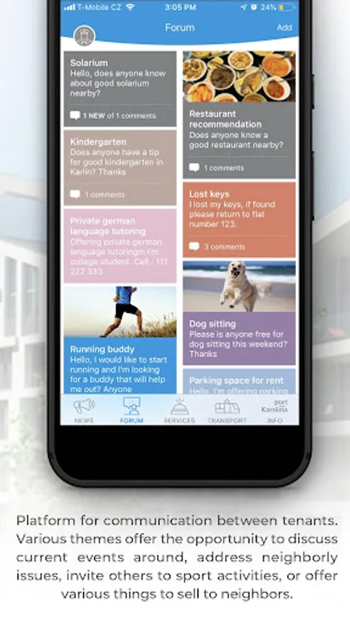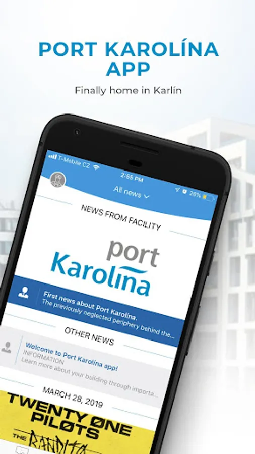This application is intended for apartment owners and visitors of Port Karolína district in Prague. All important information is organized on the dashboard which dynamically changes throughout the day. Application offers many more modules including forum, facility reports, events, my neighbours and about the building module where you can find important contact, guides and documents.