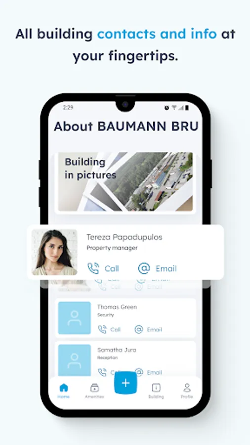 This application is intended not only for employees that work in Baumann Bru but for their visitors as well. Important information about the building is organized on the dashboard, which dynamically changes throughout the day. The app offers more functionality including forums, ability to request maintenance, events, information about companies in the building and about the building itself where you can find important contact, guides and documents.