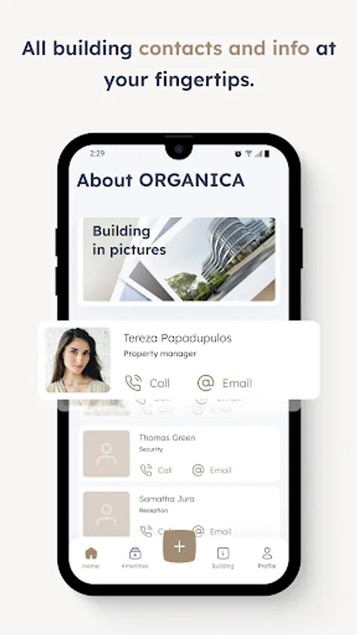 This application is intended not only for employees that work in ORGANICA but for their visitors as well. Important information about the building is organized on the dashboard, which dynamically changes throughout the day. The app offers more functionality including forums, ability to request maintenance, events, information about companies in the building and about the building itself where you can find important contact, guides and documents.