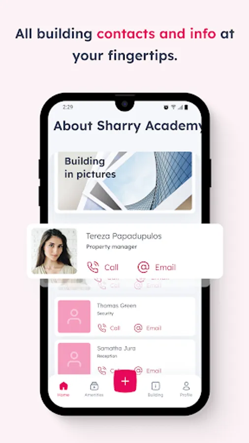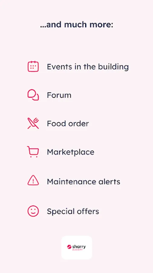 This application is intended not only for employees that work in Sharry Academy but for their visitors as well. Important information about the building is organized on the dashboard, which dynamically changes throughout the day. The app offers more functionality including forums, ability to request maintenance, events, information about companies in the building and about the building itself where you can find important contact, guides and documents.