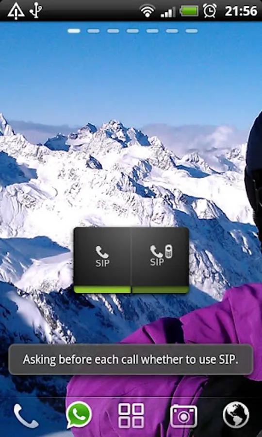 Android 2.3 (Gingerbread) and newer versions support a built in SIP/VoIP (Voice over IP) functionality. This widget has two buttons: the left one gives you a shortcut to the SIP settings. The second one allows you to select how calls should be routed primarily: you can select whether all calls should be made via SIP by default, only Internet calls via SIP, or if you want to be asked before each call.