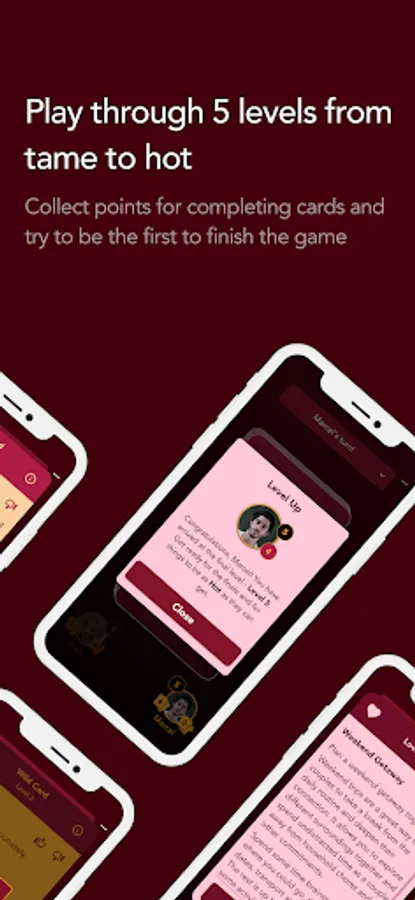 Start off tame with level 1 and work your way to the hottest level - level 5. You will be wearing less clothes, answering spicier questions and completing naughtier tasks as you progress through the levels. Collect points for completing cards, try to beat your partner to the win and select a special fantasy card to finish off the game.