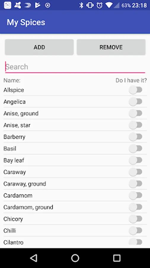 Simple spices database. You can track which spices you already have and which you have to buy. You can use predefined set of spices or add/delete your own.