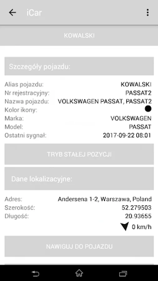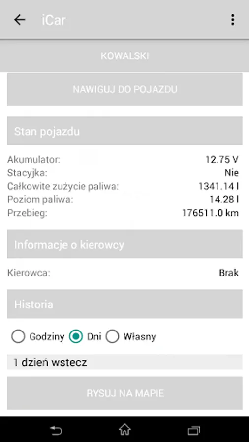 Presentation of the current position allows to determine the position of the vehicle by means of an address and geographical coordinates. Additionally, you can track the current operating parameters of the vehicle such as fuel level, current and complete combustion, engine speed, vehicle mileage, engine temperature and other. The presented data are automatically updated.