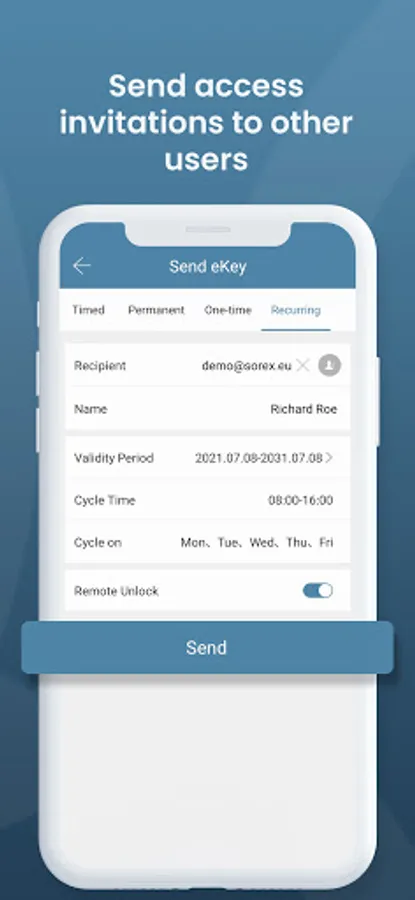 With the SOREX SmartLock app, you can easily manage and configure your SOREX door locks from anywhere. You can grant users access, create time profiles and read access logs. Also you can set a passage mode for certain times. Depending on your lock, you can also create pin codes, add fingerprints and RFID media.