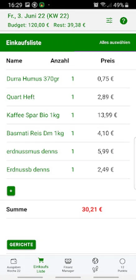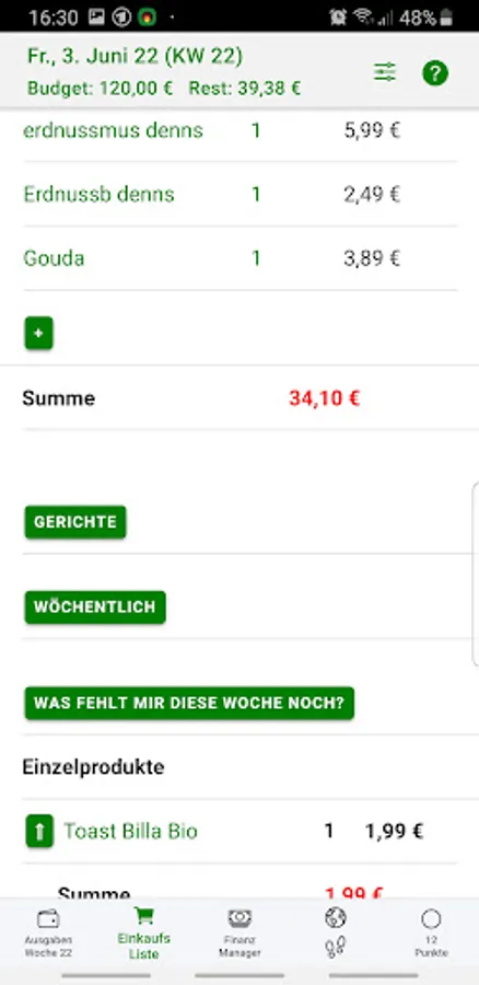 - Your personal shopping list with memory function, a list of weekly purchases and individually definable dishes and product groups