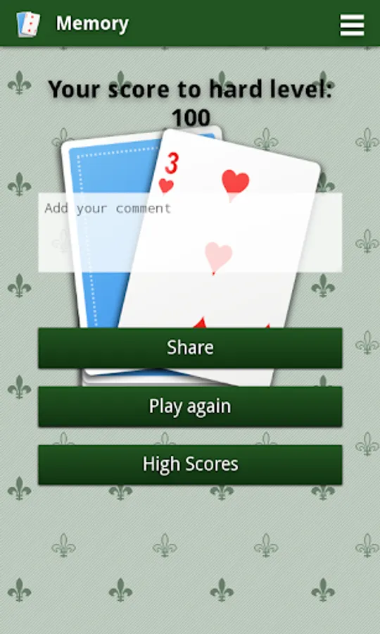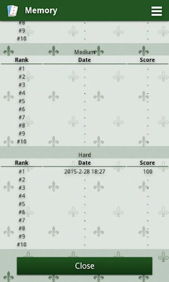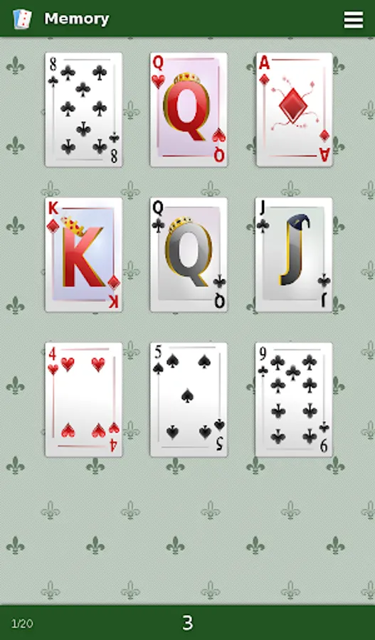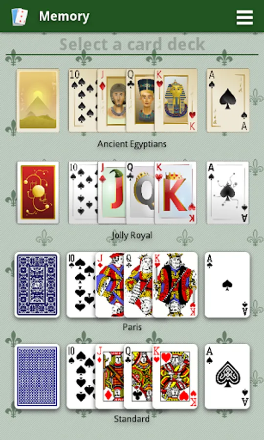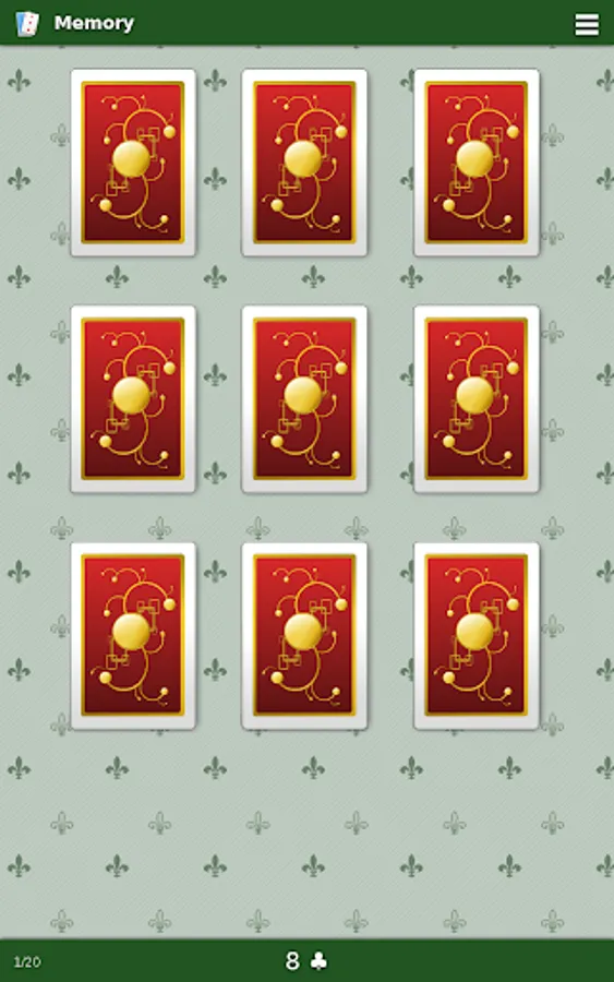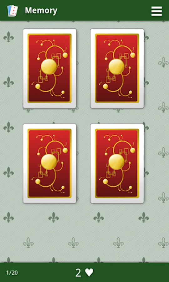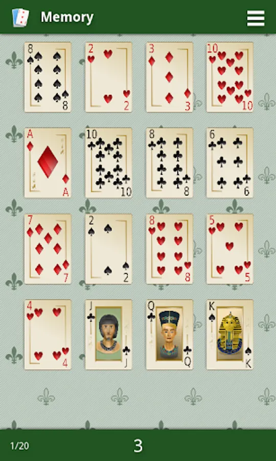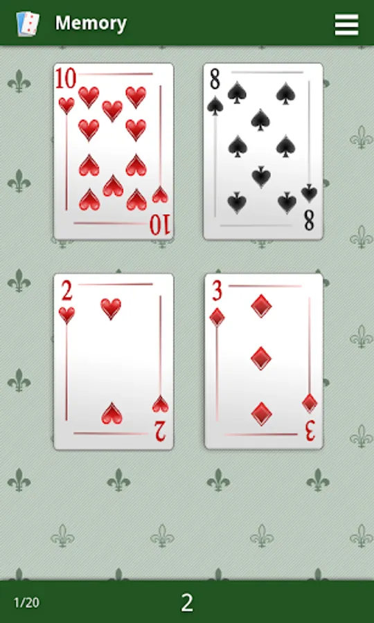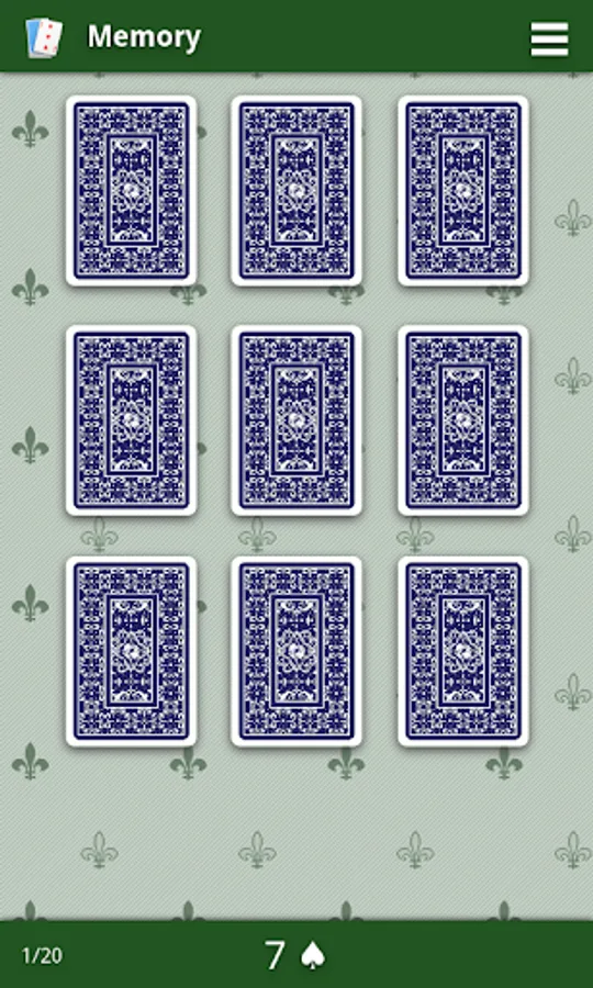 Train your memory with this game. Look at the cards and remember the location. This game uses the french cards always shuffled randomly and you have a set time to see the cards. Finish the game and discover the score that you can publish on social networks. Will store the 10 best scores for each level.