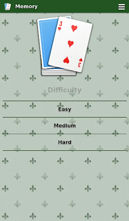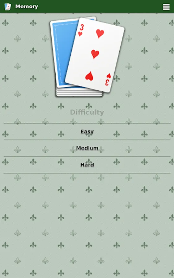 Supports 3 levels of difficulty: easy, medium and hard; respectively with 4, 9 and 16 cards.