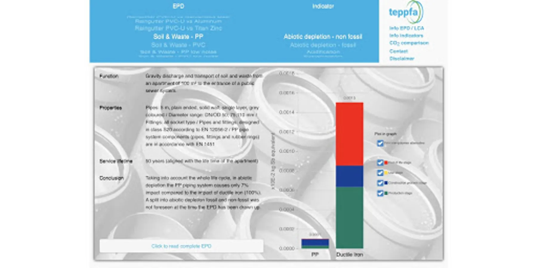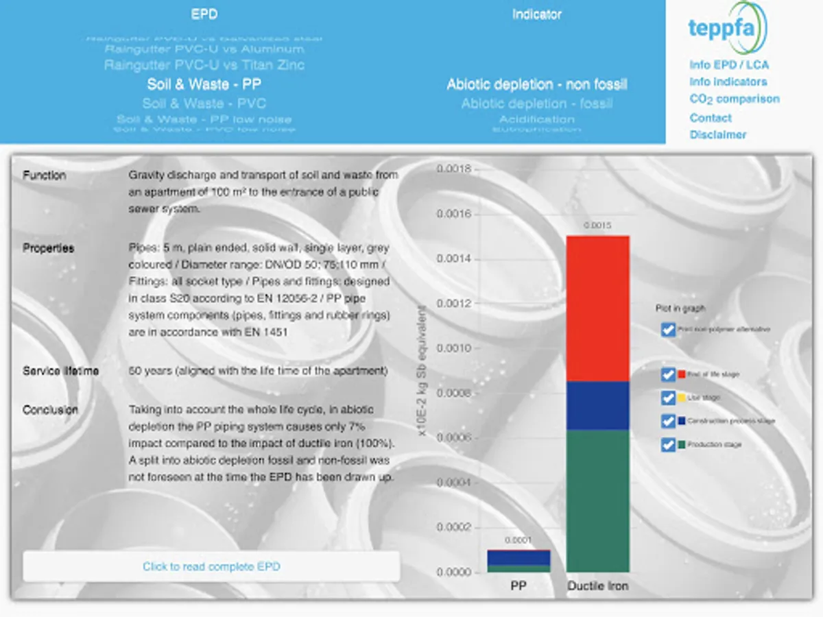 Within the app you can select the pipe systems application area, material and environmental impact criteria. One can also view the complete Environmental Product Declarations on the plastic pipe systems.