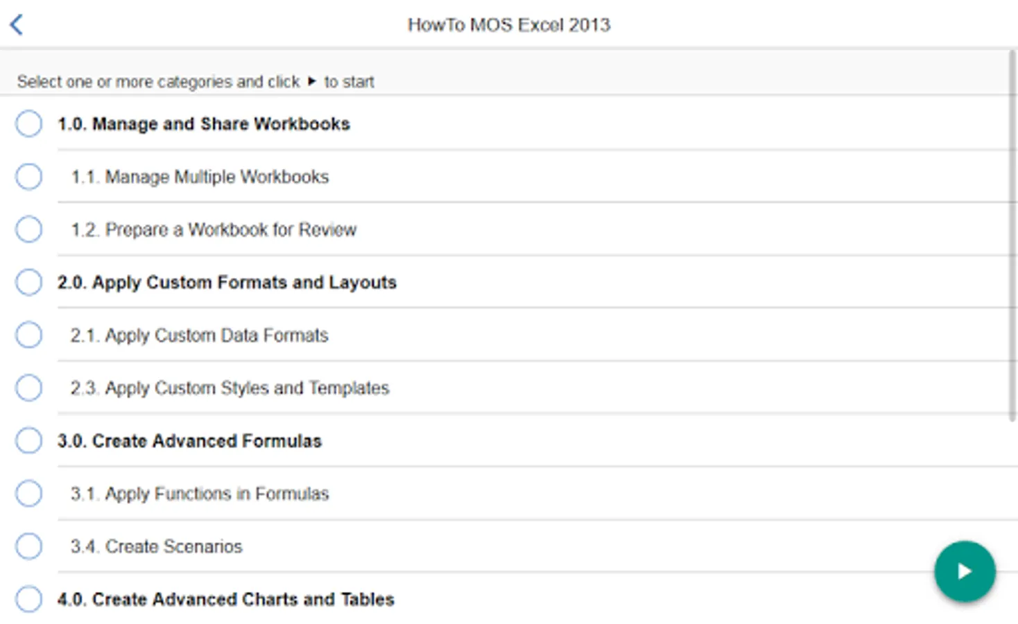 This provides the users with the opportunity to get an initial picture about the MOS Certiport 77-420, 77-427 & 77-428 Exams, which lead to the respective Certificate acquisition for MS-Excel 2013.