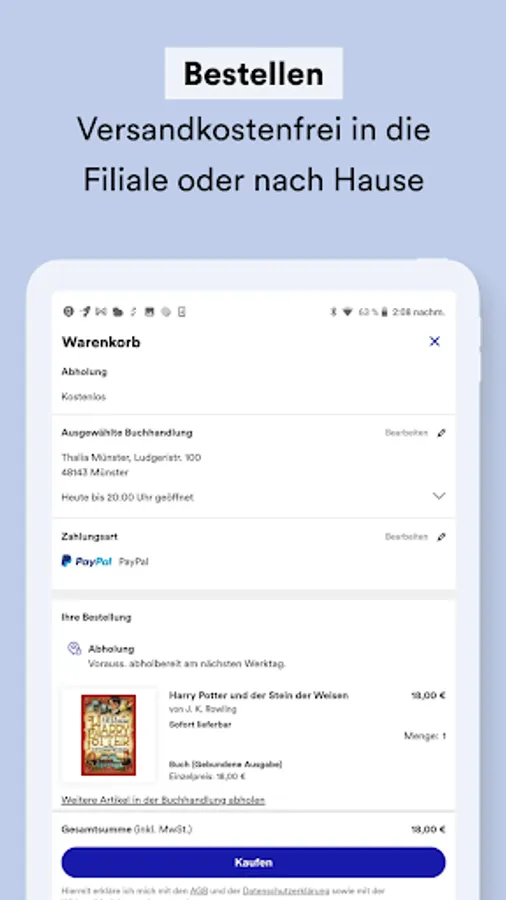 Shop in the bookstore with the Thalia app and pay with your mobile - without queuing at the checkout. Simply scan the desired product, pay and go!