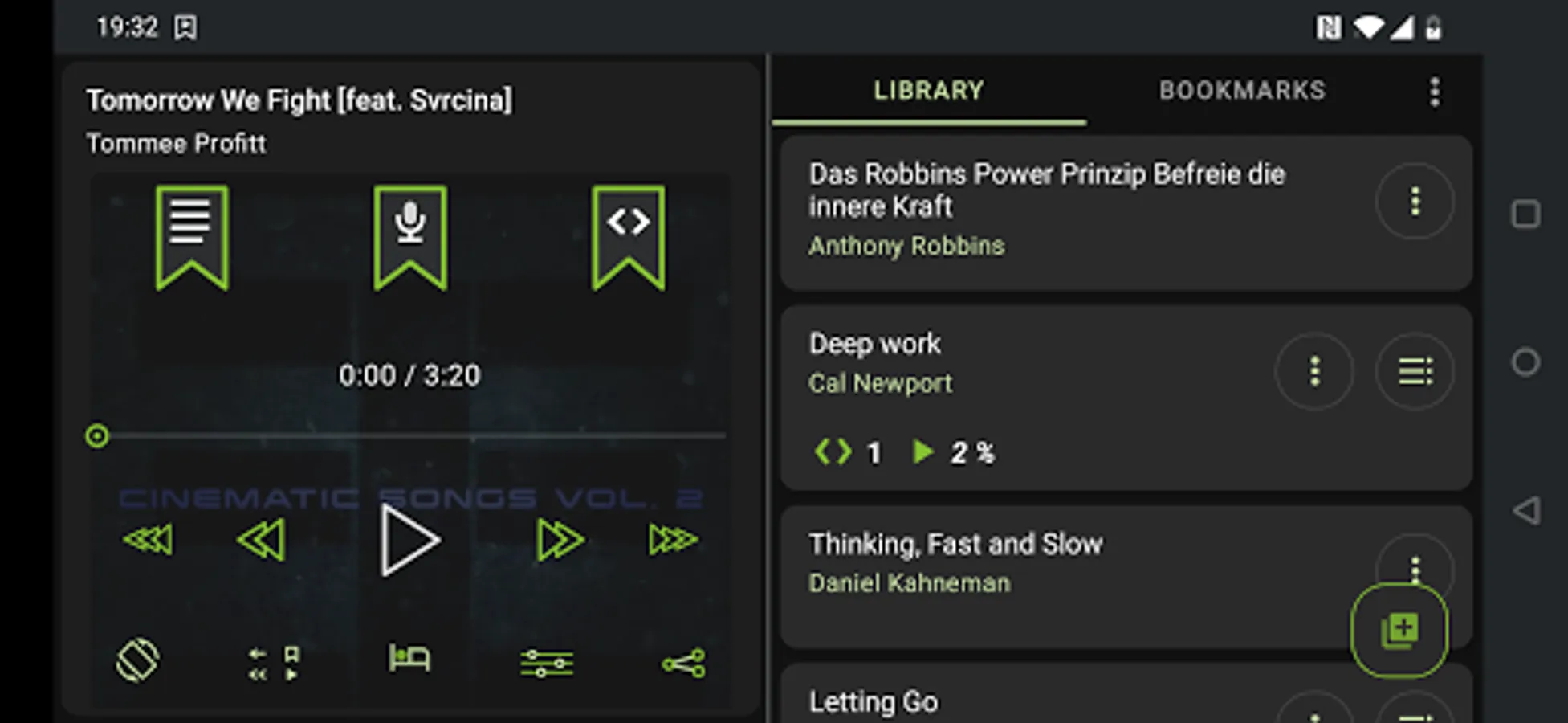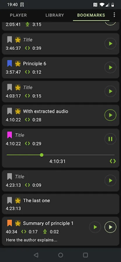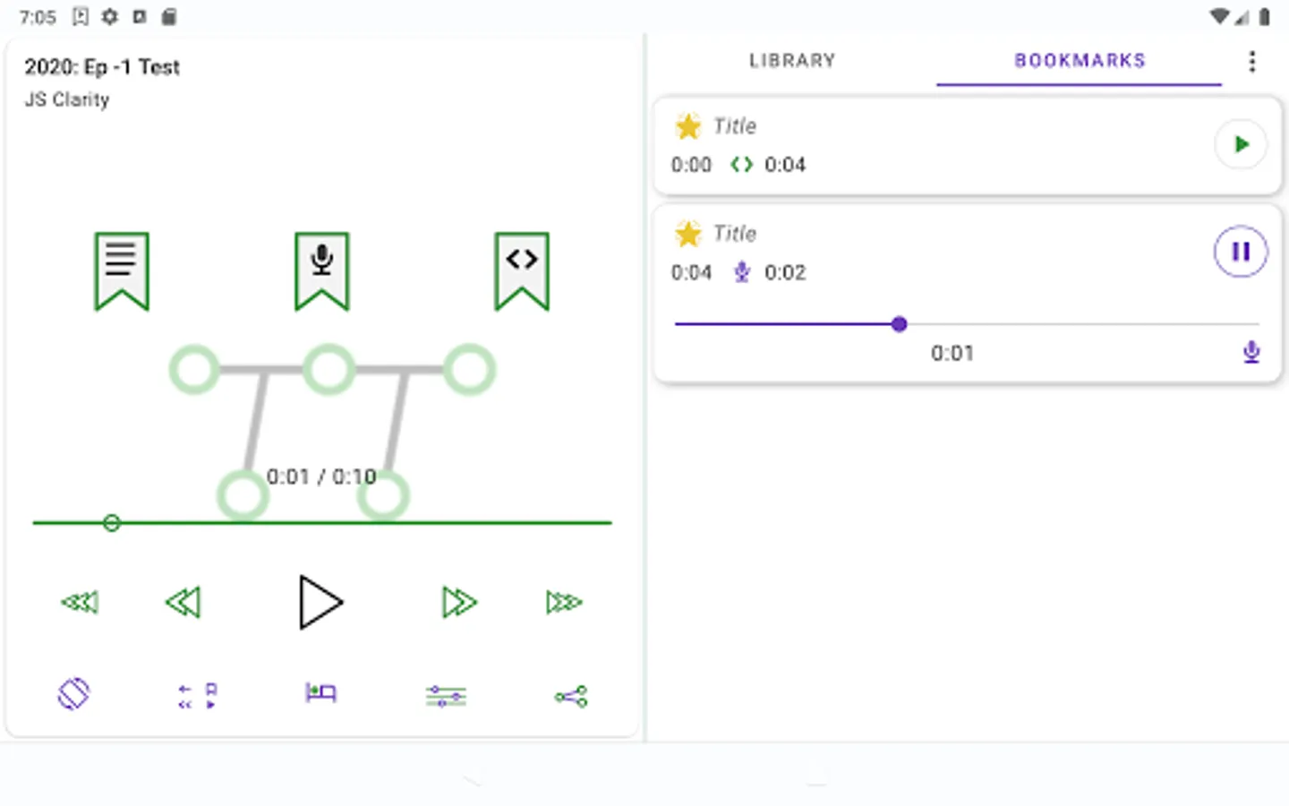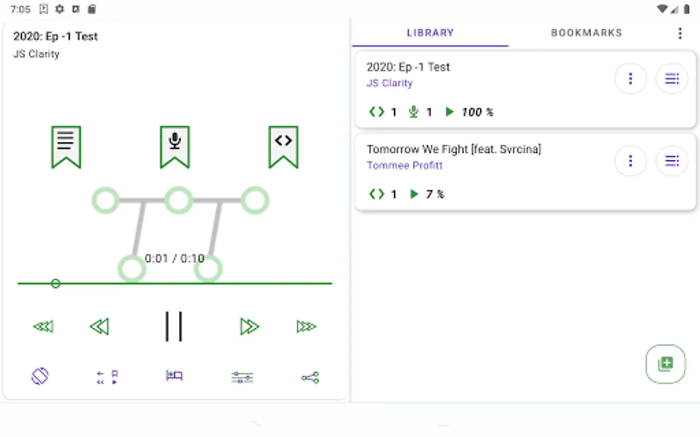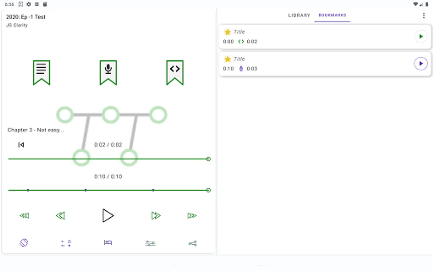 The audiobook player allows taking voice memos, text memos and interval bookmarks while listening to an audiobook. The aim of the app is to offer the most convenient ways of saving bookmarks and ideas so you can review them later.