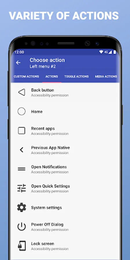 Back Button, Recent Apps, Home, Previous App, Toggle Bluetooth, Wifi, GPS, Auto-Rotate, Split Screen, Sound, Brightness, Cursor, Launch an application, Launch a shortcut (Dropbox folder, Gmail label, contact, route, etc.)