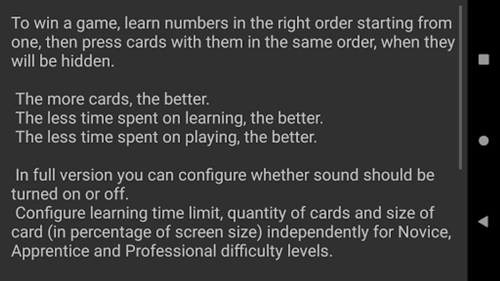 In the full version user can specify the quantity of cards, and the time they will be displayed on the screen (the longer, of course, the easier to remember).