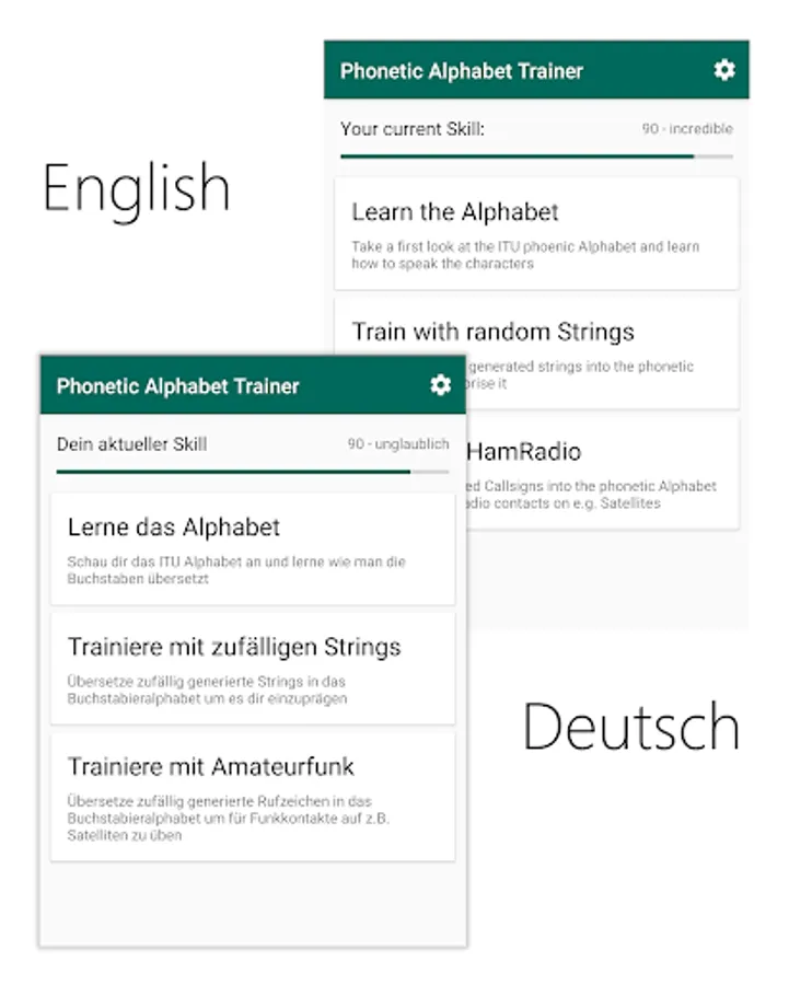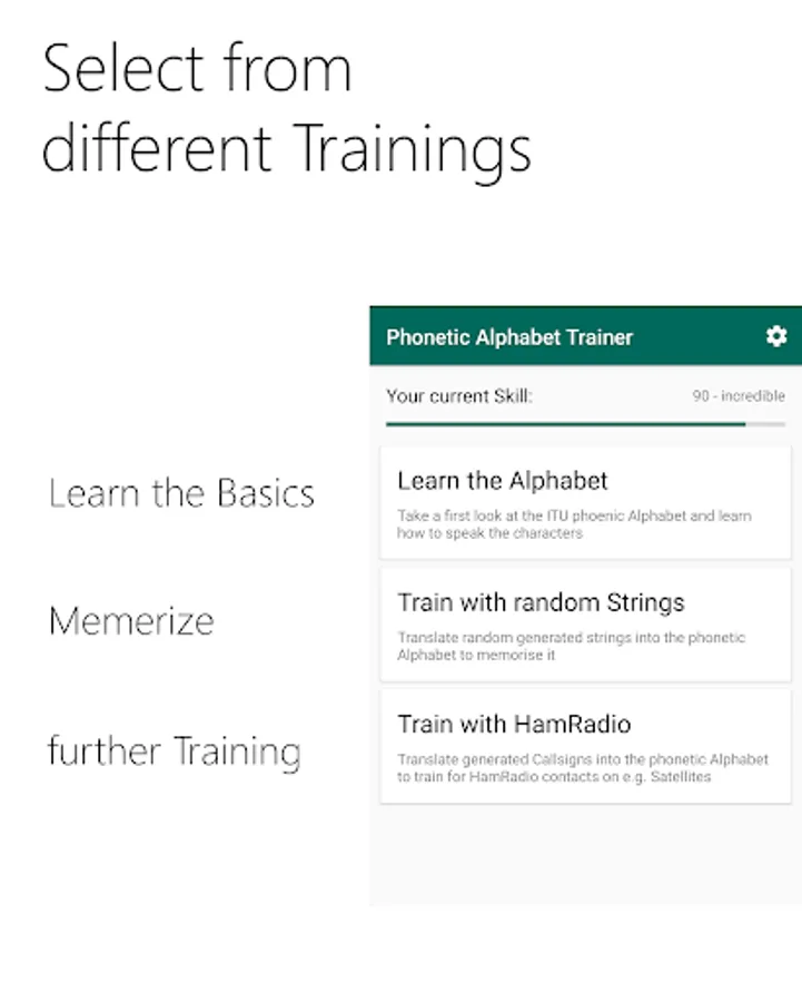 The Phonetic Alphabet Trainer is an App you can easily learn the Alphabet that is used in the Military and on Hamradio contacts. The App has different options for you to learn and memorize the Alphabet. Your current Skill Level is displayed on the main screen and indicates how good you are at the Phonetic Alphabet.