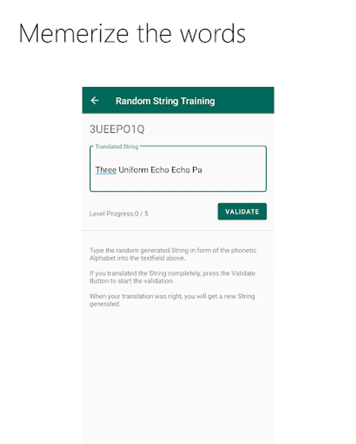 Let the App generate random Strings and translate them into the Phonetic Alphabet.