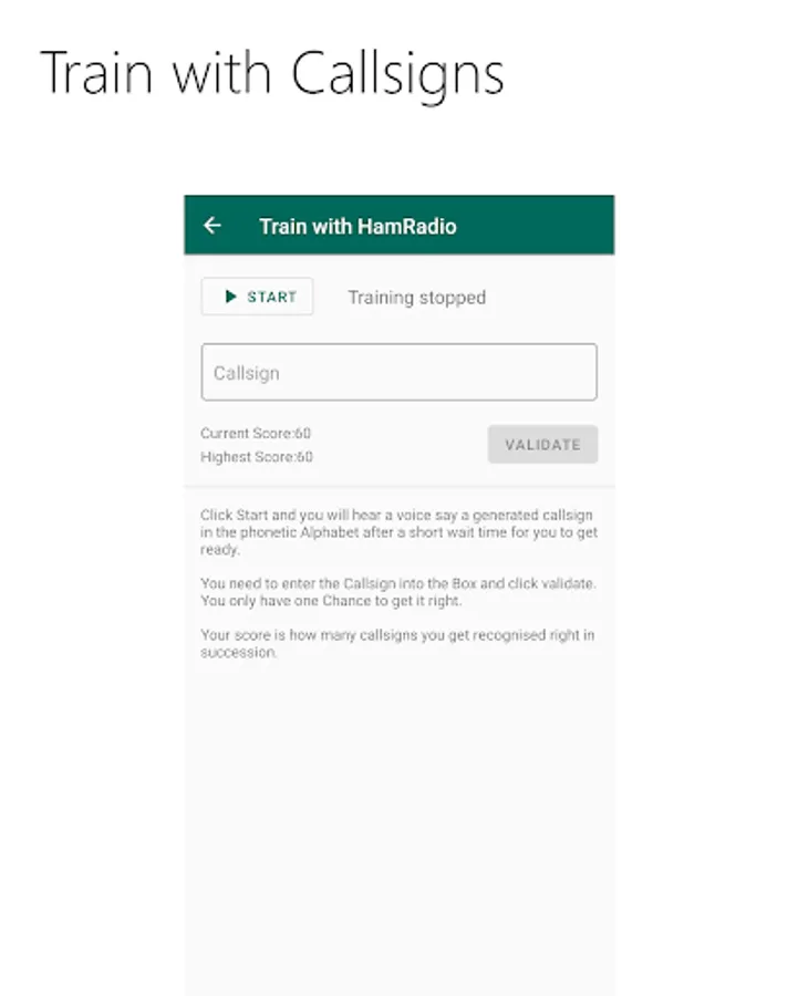 The App generates a random Callsign and speaks it out loud in the Phonetic Alphabet. Your Task is it to Write down the correct Callsign. You only have one try to get it right, your score is how many you recognize correctly in a row.
