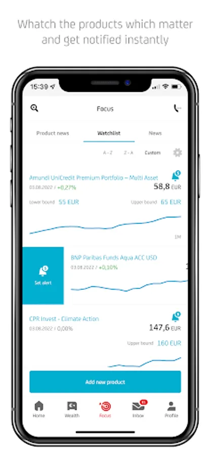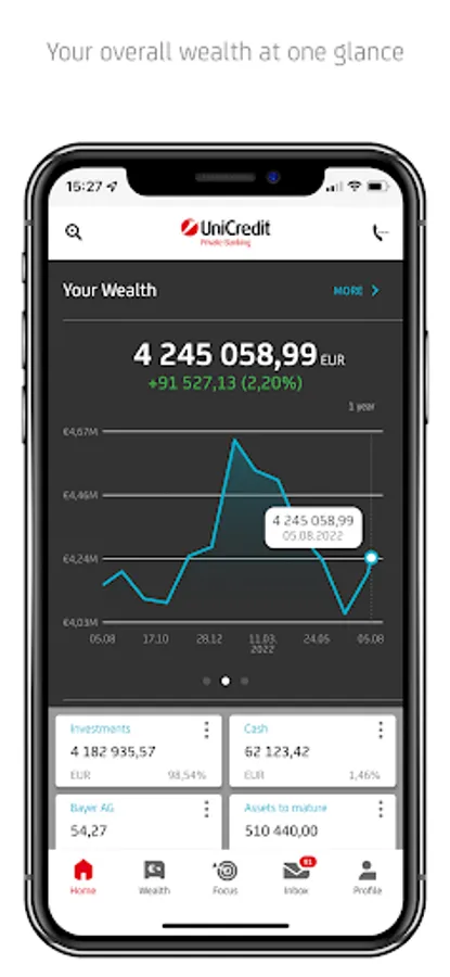 Private Invest is a wealth management application for UniCredit Private Banking clients. The app gives you the opportunity to follow your financial situation anytime, anywhere. Follow the evolution of your portfolio, get deep insight to your current cash and security holdings, asset allocation, portfolio performance and assets breakdown. Create your own Watchlist with your favorite securities, and easily check your transactions, dividends, or upcoming maturities. Your Banker will always provide you the latest product news and up to date recommendations. Finally, you will be able to execute your trades on your own or easily accept order drafts prepared by your banker. UniCredit Bank is constantly developing and upgrading the application with new features and functions to provide their clients a great user experience. If you are a UniCredit Private Banking client, contact your banker to find out more, and activate the application.