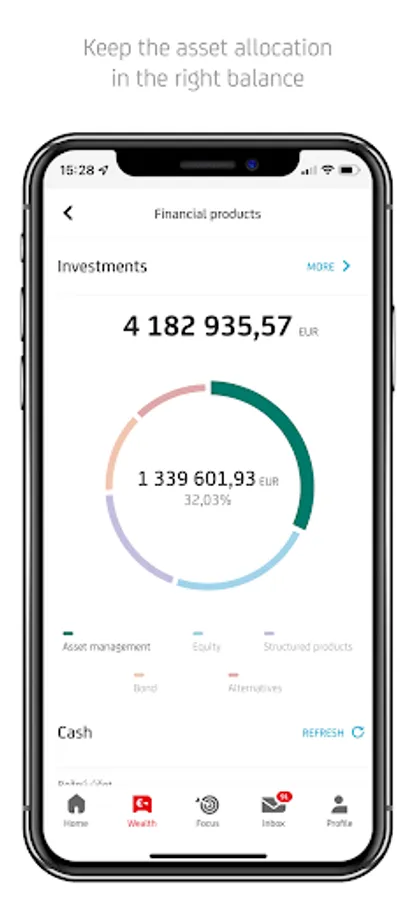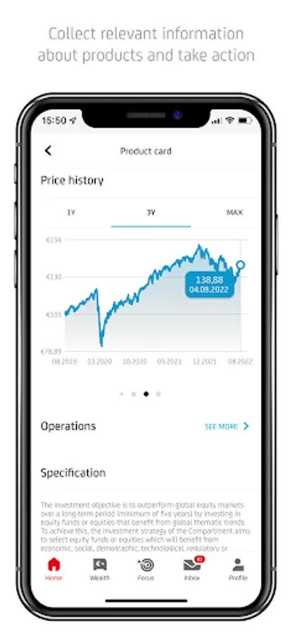 Private Invest has five main areas, which help you to navigate in the menu – Home, Wealth, Focus, Inbox and Profile. The main functions of the app are categorized in widgets in every area. Swipe the widgets left or right to see your portfolio from a different time perspective, or reach additional action buttons. Click on “More” to expand the widget and get full details.
