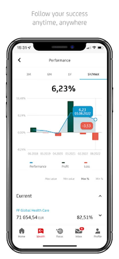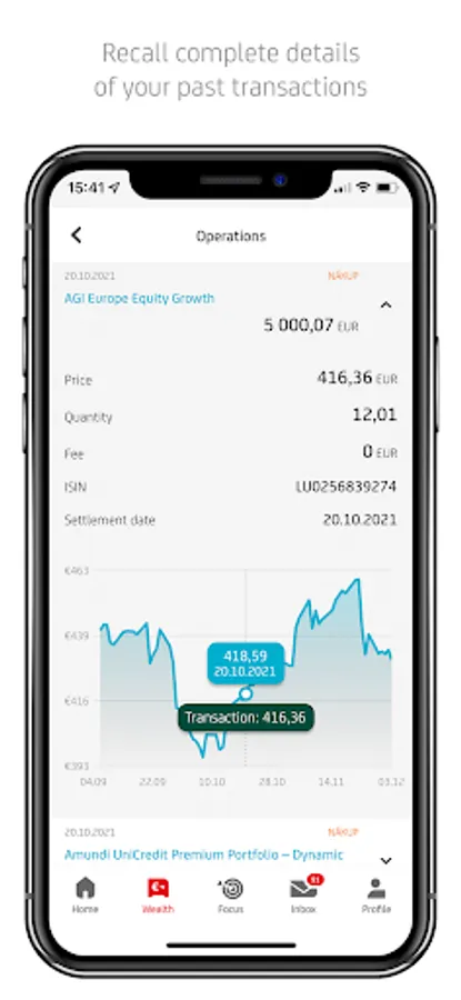 Portfolio evolution shows you the change of aggregated value of your assets within UniCredit Bank in your main currency. Swipe through different time horizons and analyze your portfolio from different perspectives. Keep your wealth under control by understanding how cash flows or evolution of your investments affected your overall portfolio..