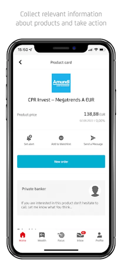 Possibility to get the latest investment ideas from your banker in line with your profile. If you would like to find out more you can start conversation with your banker, check the videos and other supporting materials or save the idea for later. Once you are convinced that the product is the right one for your portfolio, you can just in few clicks execute your investment in fully digital way. If you have your own idea, just search among available products, and proceed with the order.