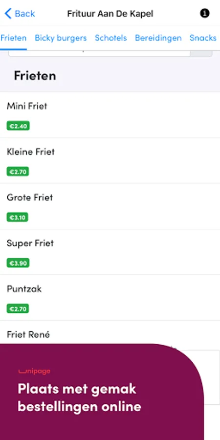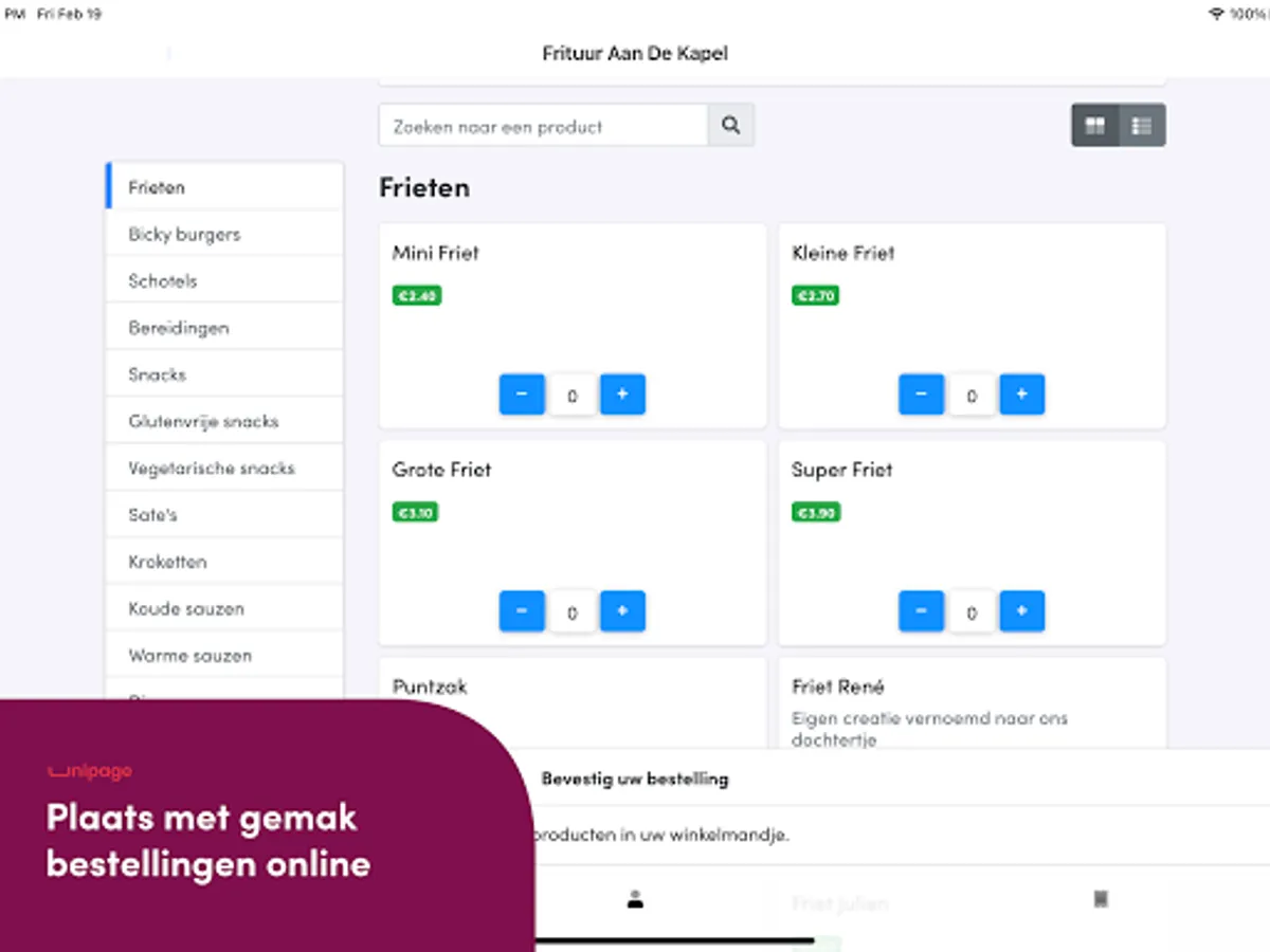 Fancy some tasty fries? Then you have come to the right place at Frituur Aan De Kapel. Come by or order online! Avoid queues and order your fries from your seat!