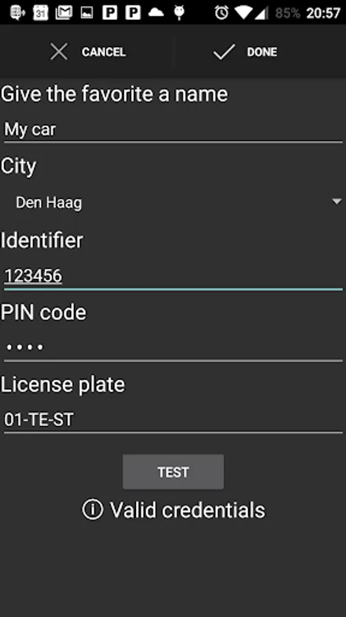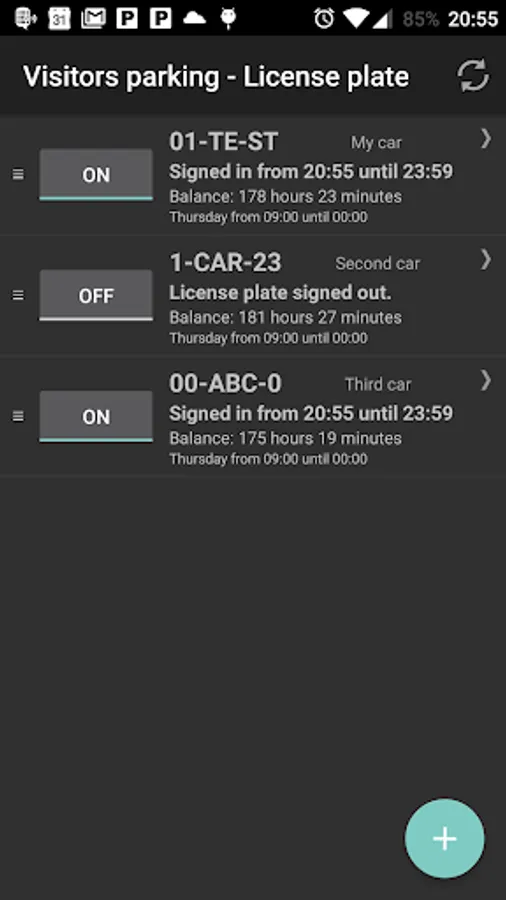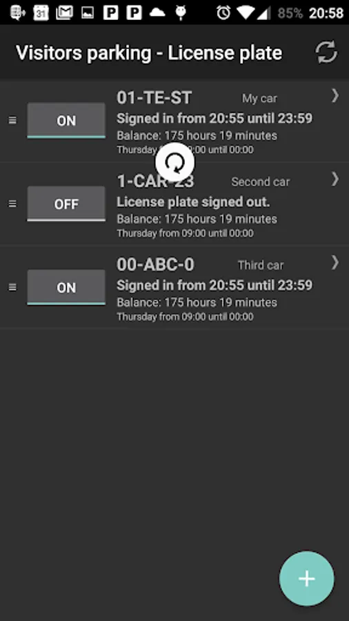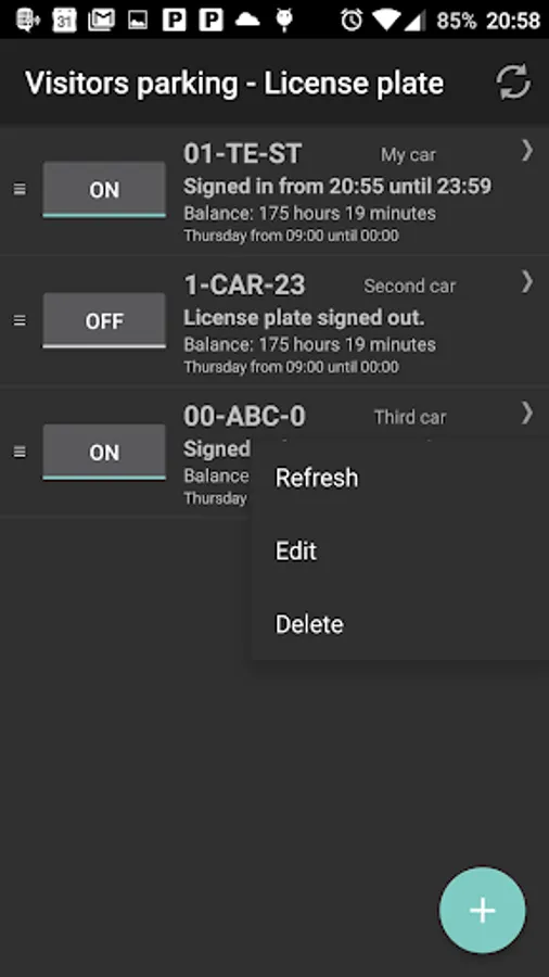 Entering multiple license plate at once and save them securly. How: Simply press on the '+' button (bottom right) in Visitors parking - License plate app. Fill-in identitier (dutch: 'meldnummer'), PIN code and license plate for regular visitors. You can store unlimited number of license plates.