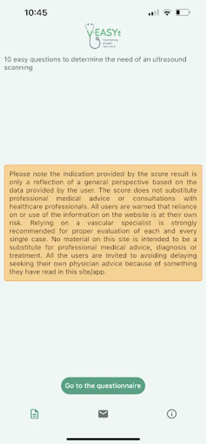 v-EASY-t app offers a multi-lingual self-evaluation tool aimed to suggest the need of an ultrasound scanning by a specialist and it provides a pool of experts available to address the first concerns of the population affected by lower limb signs and symptoms.