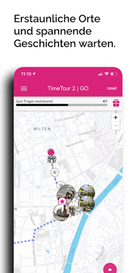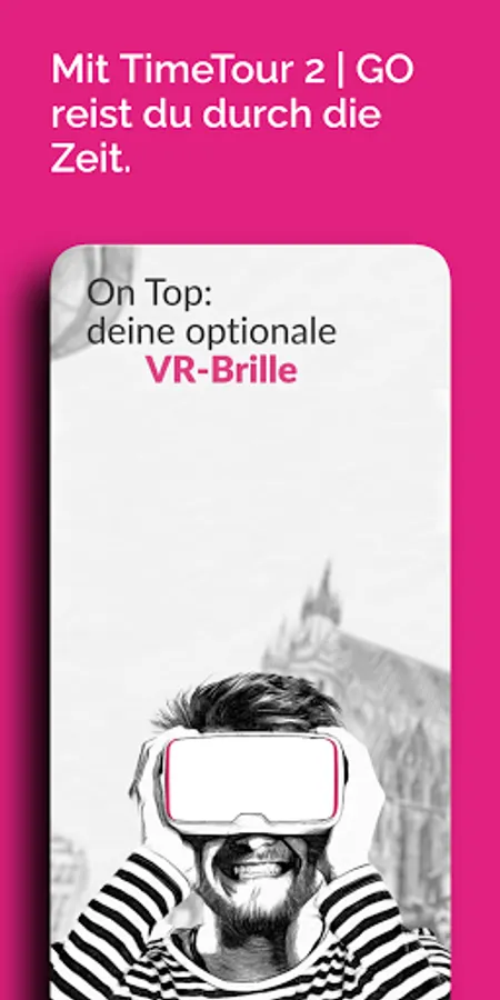 Choose a city and your TimeTour. Go to the starting point and start your time travel whenever you want. Using interactive navigation, we will guide you to the most beautiful and exciting places. TimeTour 2 | GO recognizes where you are at the moment and offers you opulent pictures and exciting stories - to match your location. Would you like to completely immerse yourself in our historical imagery? Grab an optional VR glasses! Solve exciting puzzles during your exploration tour and receive attractive rewards.