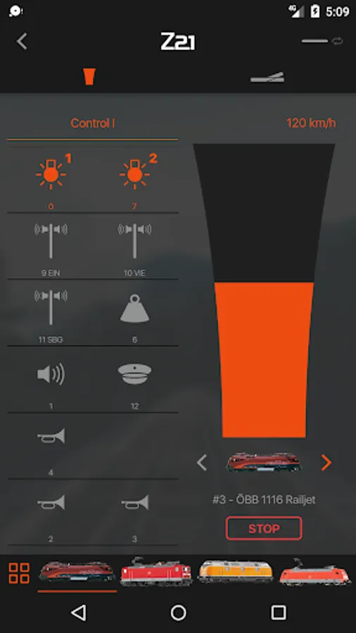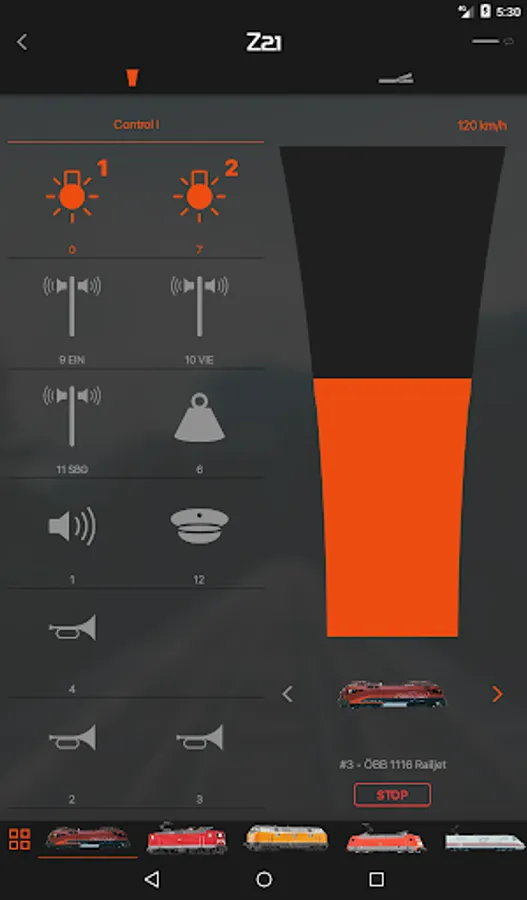 Model train control was never this easy and convenient: With one swipe of your hand you can scroll to your model of choice in the locomotive library. A slight touch on the headlight symbol and the front and backlights go on. A second touch, this time on the speaker symbol, and the locomotive makes a sound. Drag your finger over the speed indicator and the train accelerates.