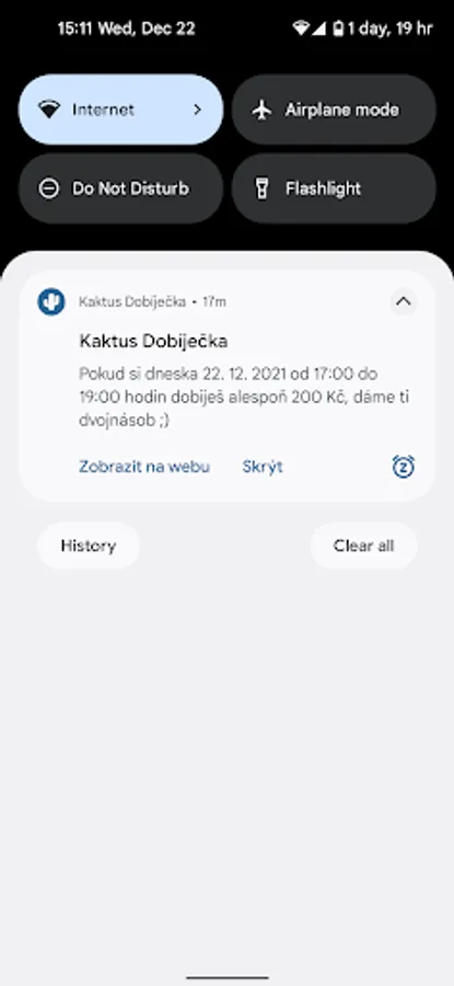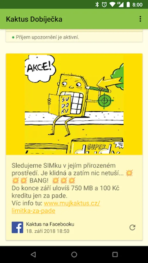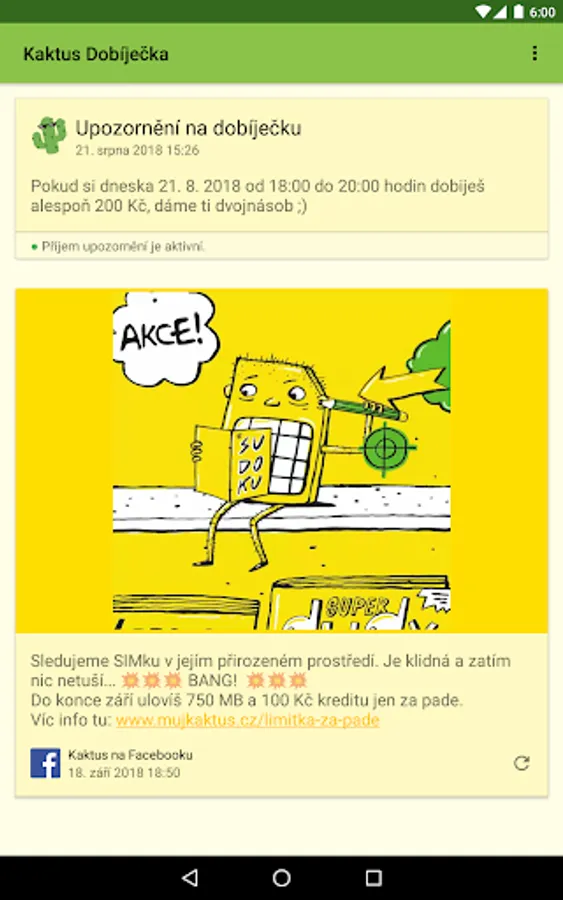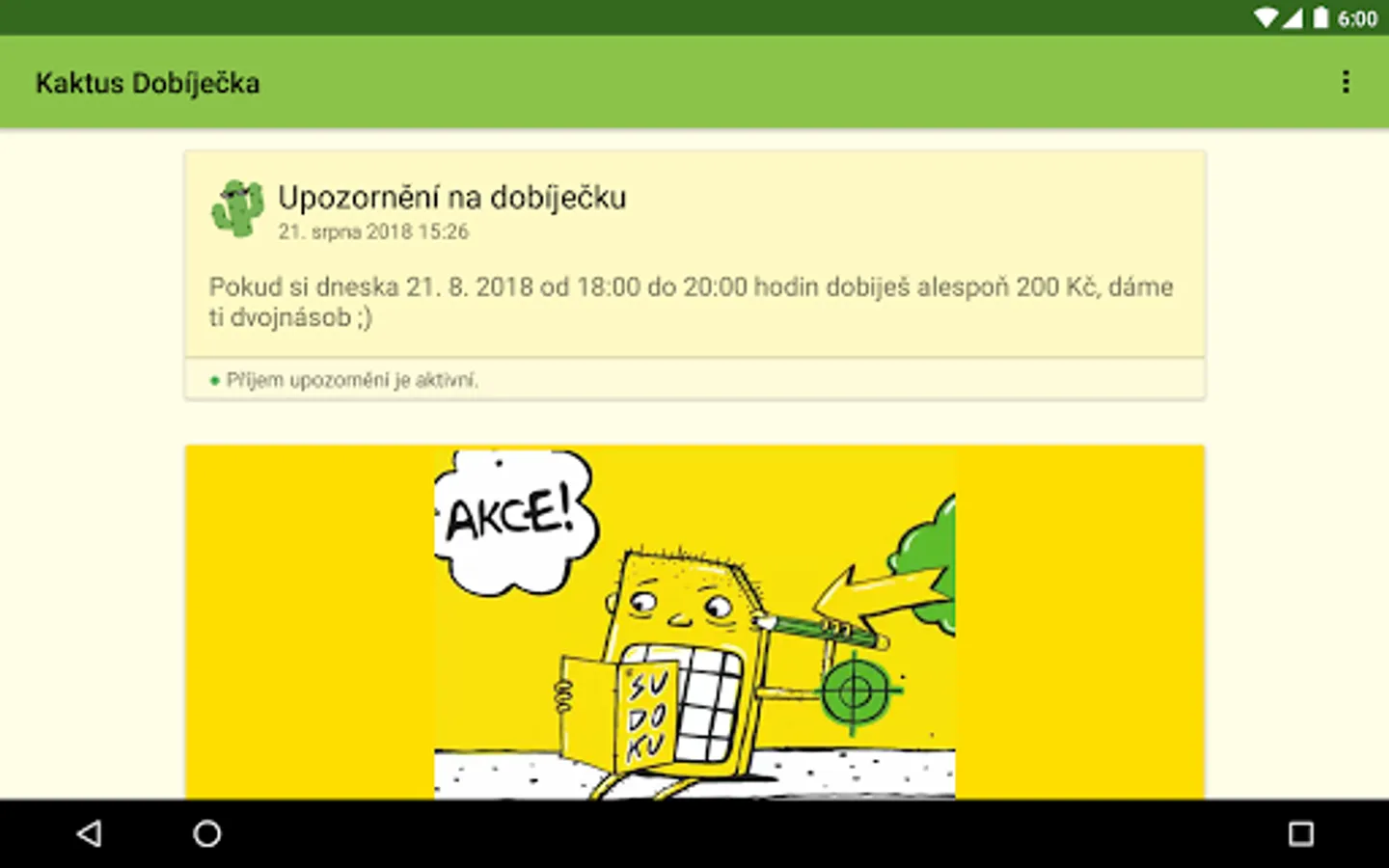 The app announces the start of the event, when the mobile operator Kaktus doubles the top-up credit. So you'll never miss it again