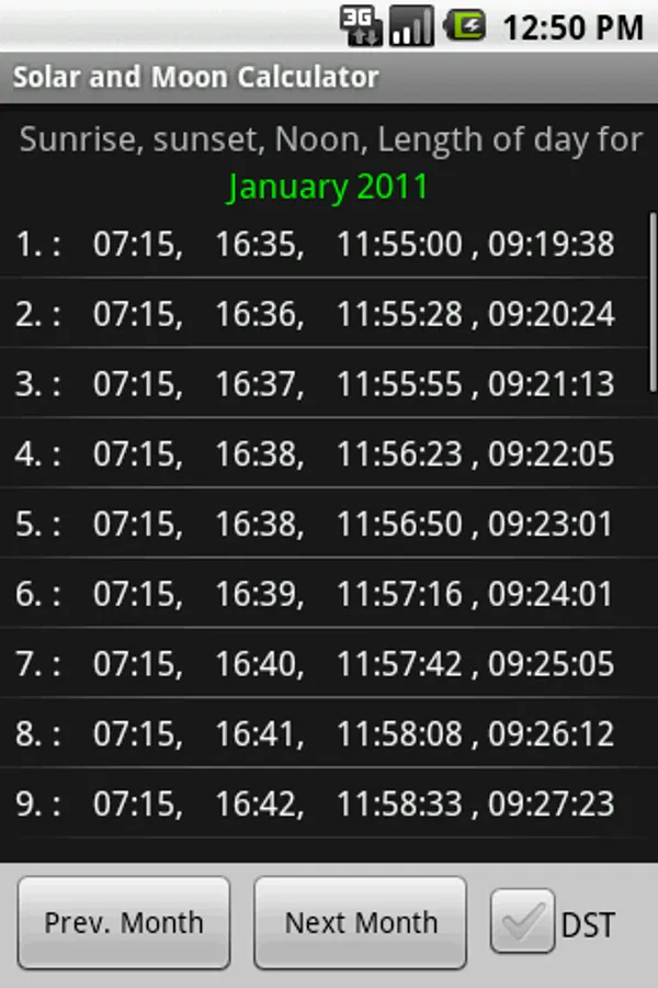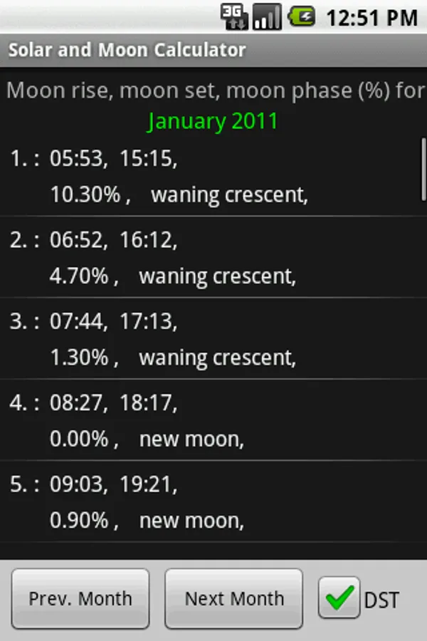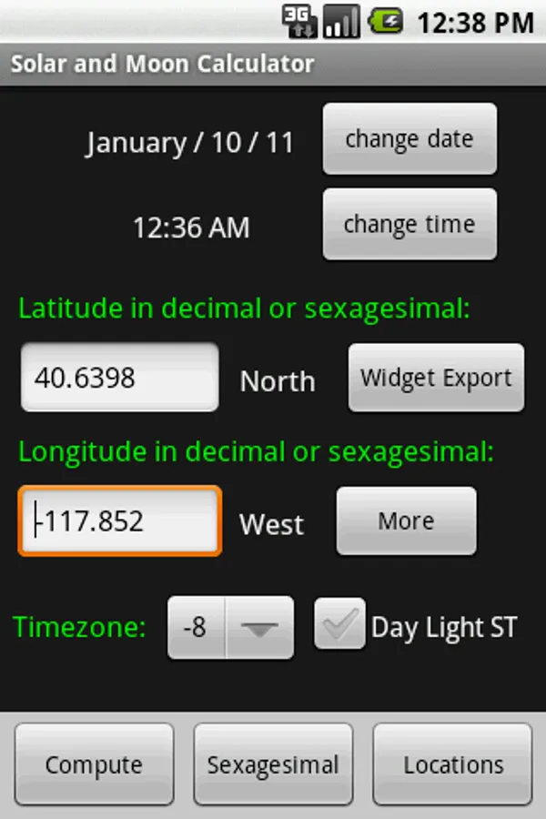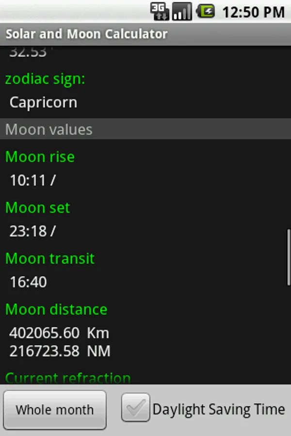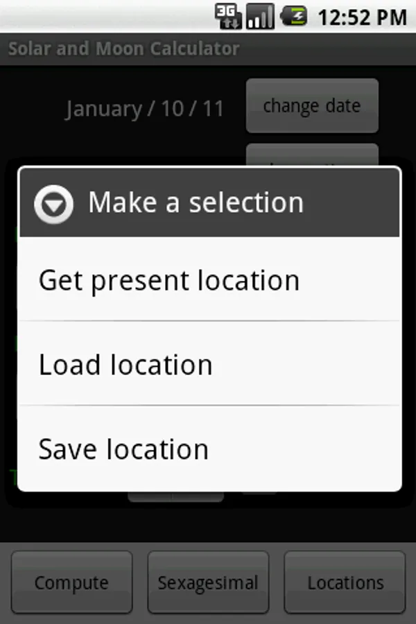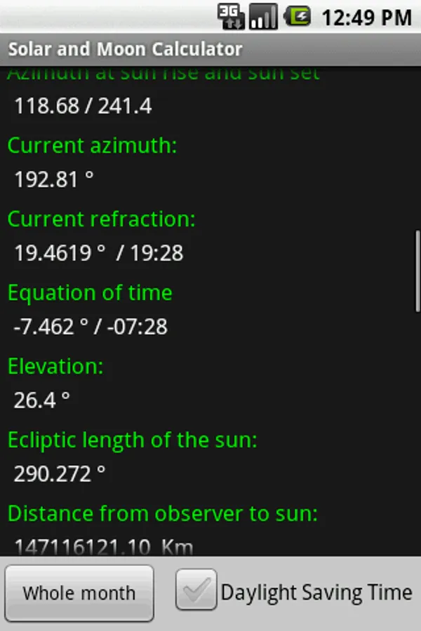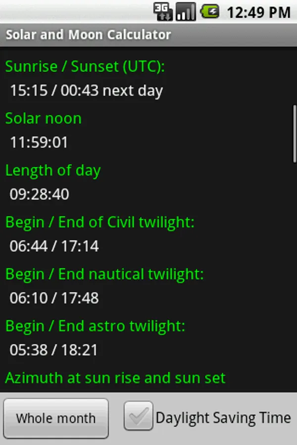 Calculates different sun and moon values of a desired position. The input can be manually or by GPS/Network.