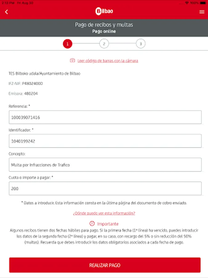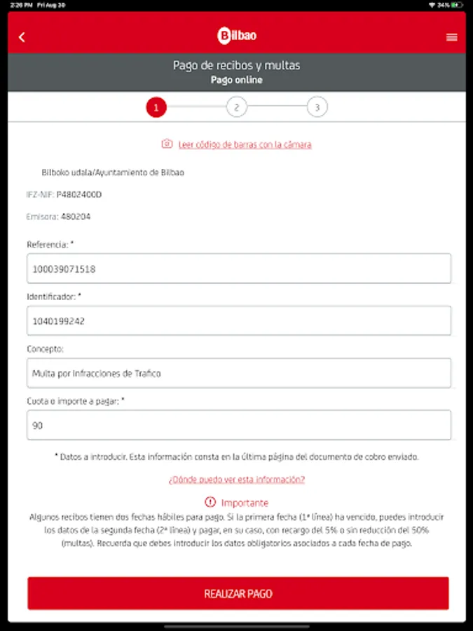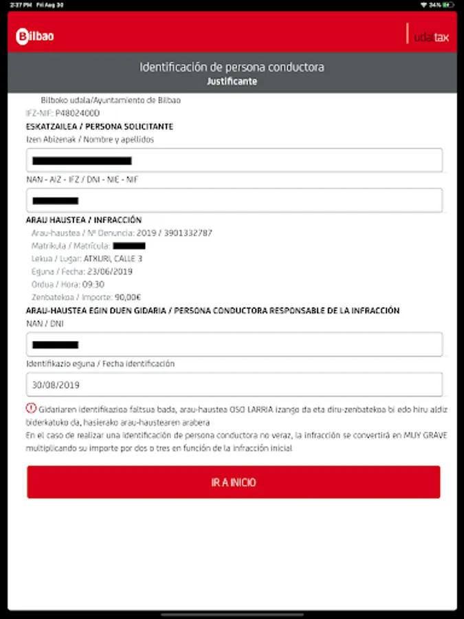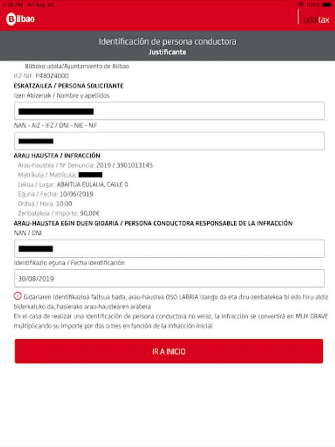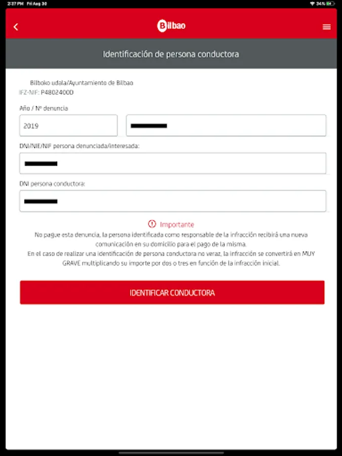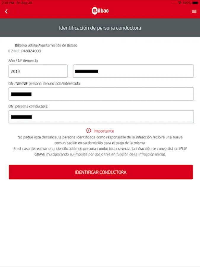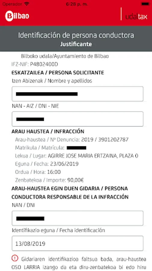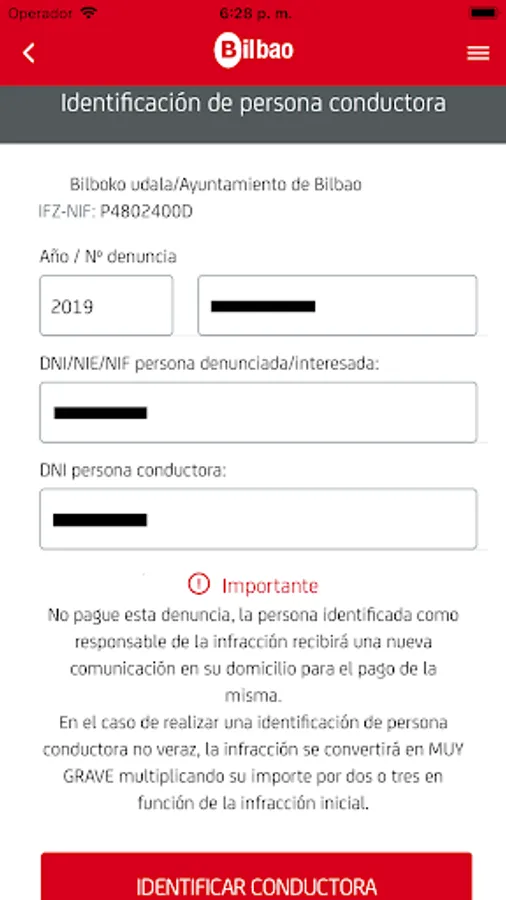 In the udaltax auto version, enter the year and number of the complaint indicated in the communication received at your address, the NIF of the person reported and the DNI of the identified driver. Through this app it is not possible to identify legal or foreign persons.