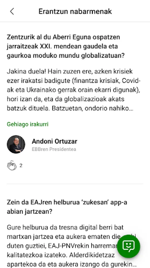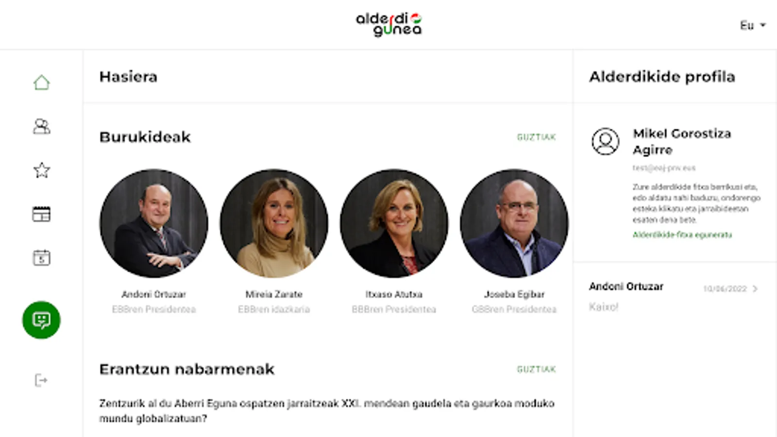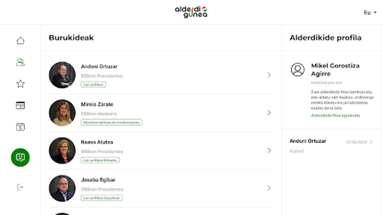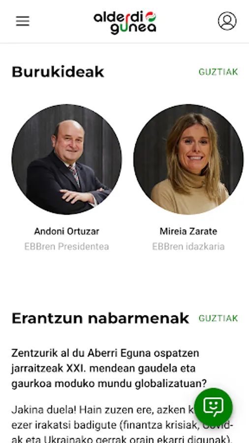 Connect with the burukides of Euzkadi Buru Batzar and share your opinions, problems and dreams with them. Easily start conversations and get a direct response to your concerns, questions and suggestions.