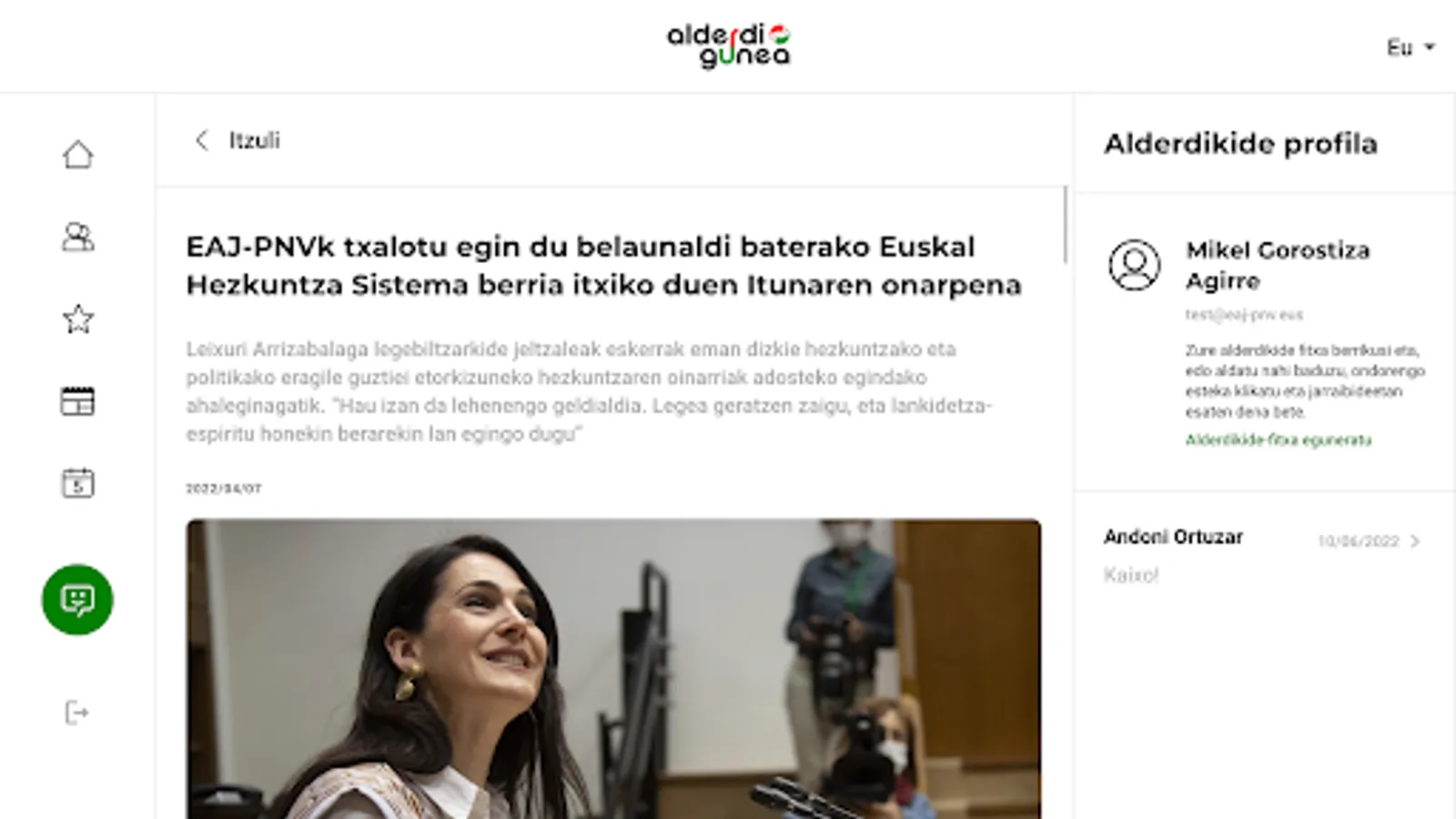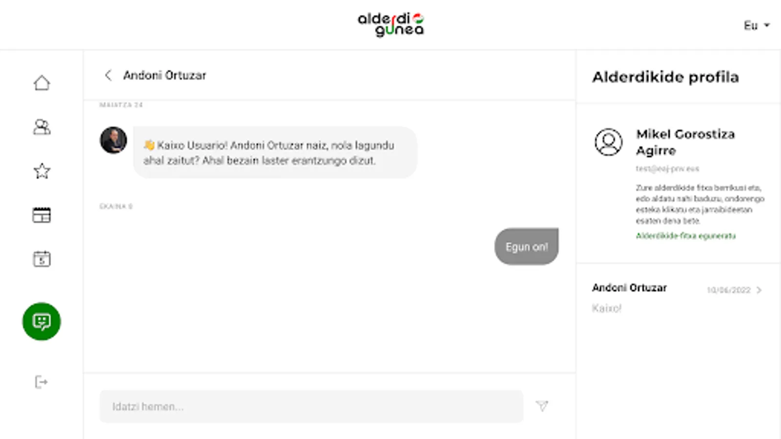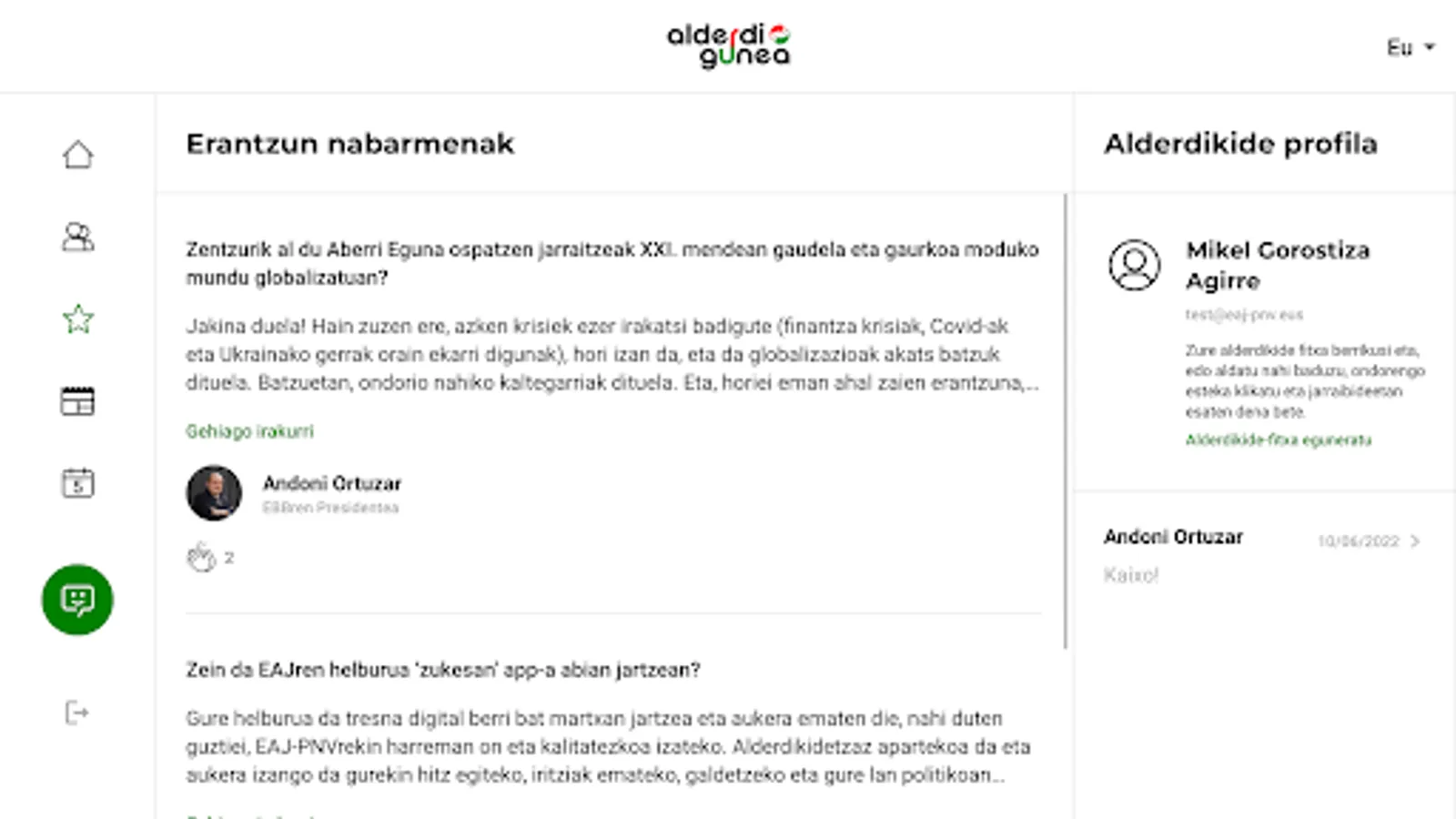 Connect with the burukides of Euzkadi Buru Batzar and share your opinions, problems and dreams with them. Easily start conversations and get a direct response to your concerns, questions and suggestions.