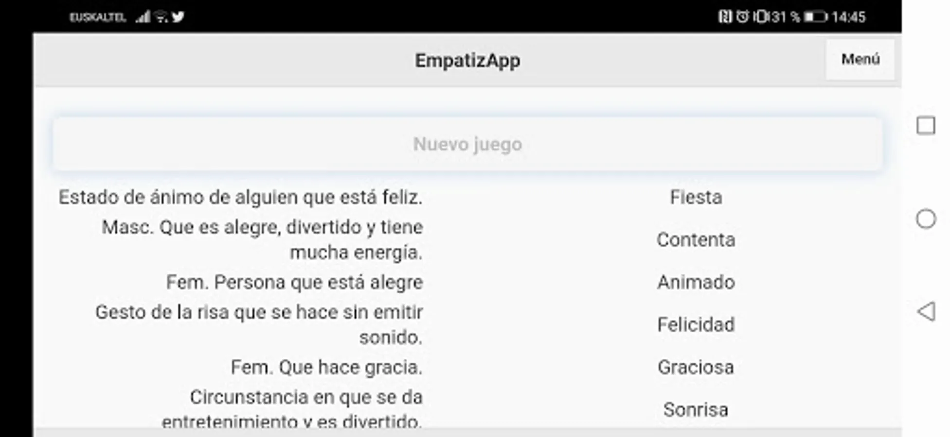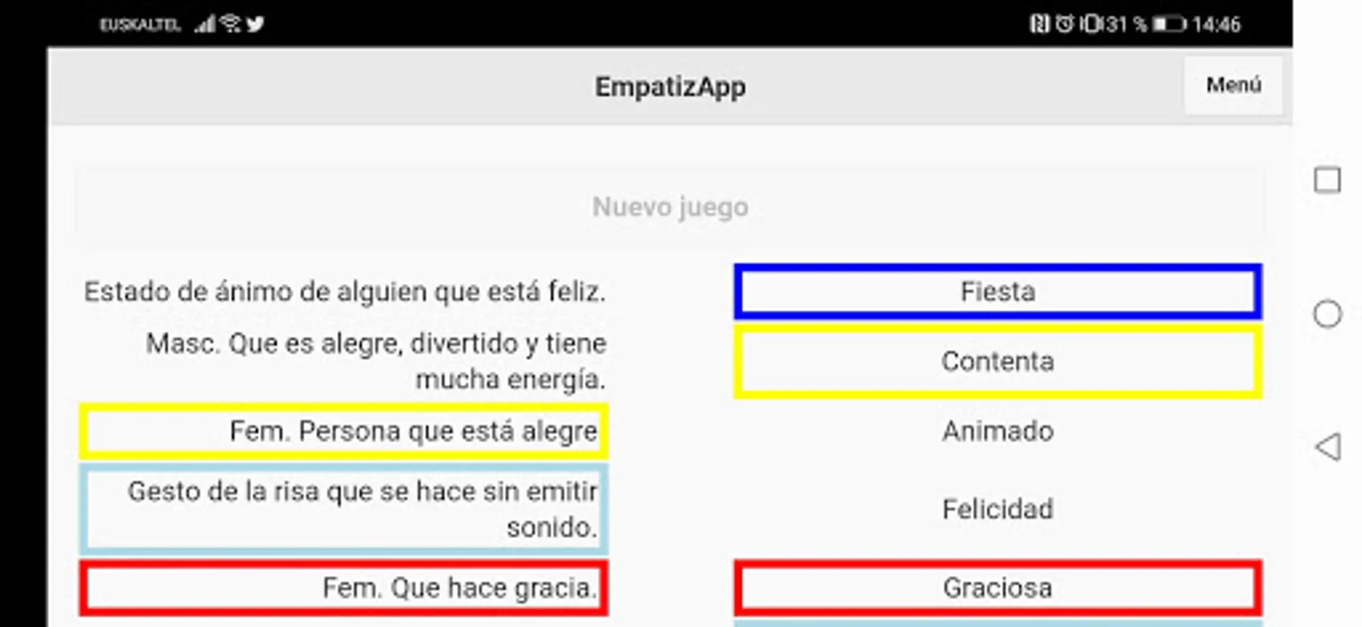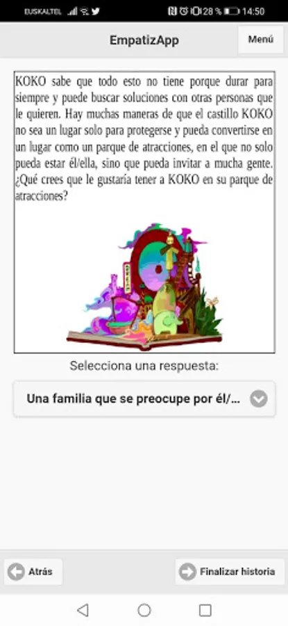 EmpatizApp consists of four stories, each one related to a different emotion. In them, users will be able to enjoy a narration interrupted by certain questions that will involve the reader. At the end of each story, they will have a game which will be related to the emotion worked on. Users will be able to work on the different emotions through word search, questions a) -b) -c) or join different