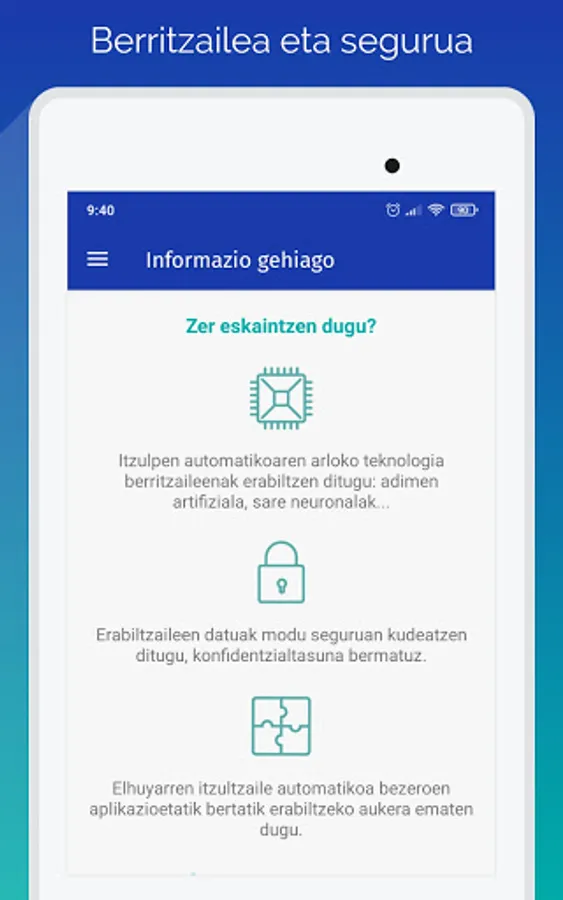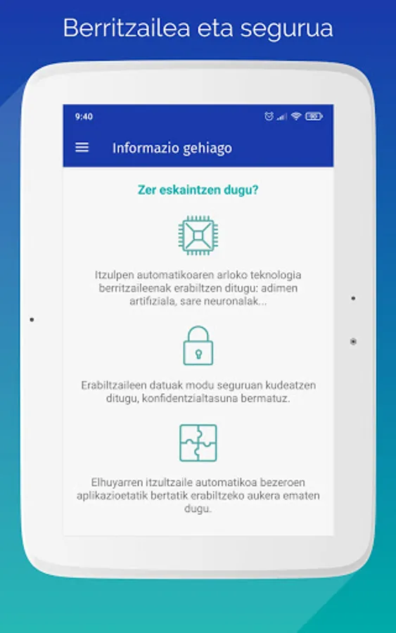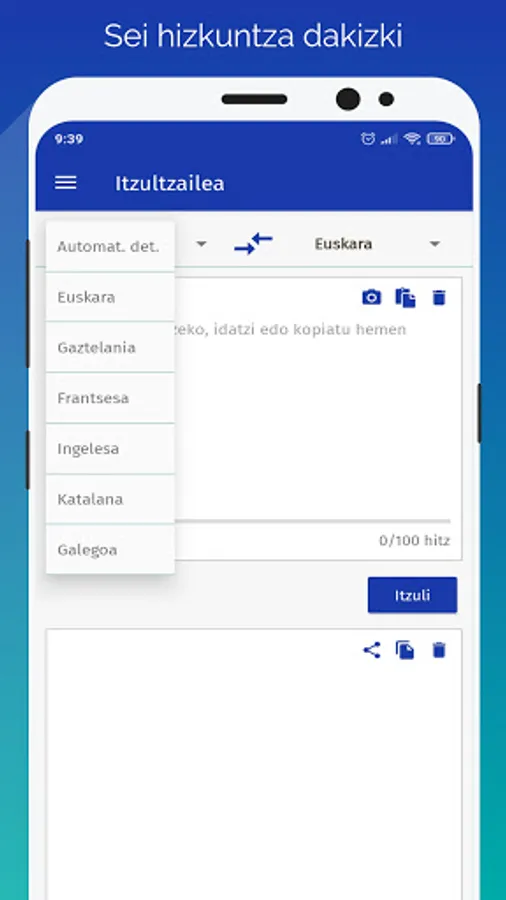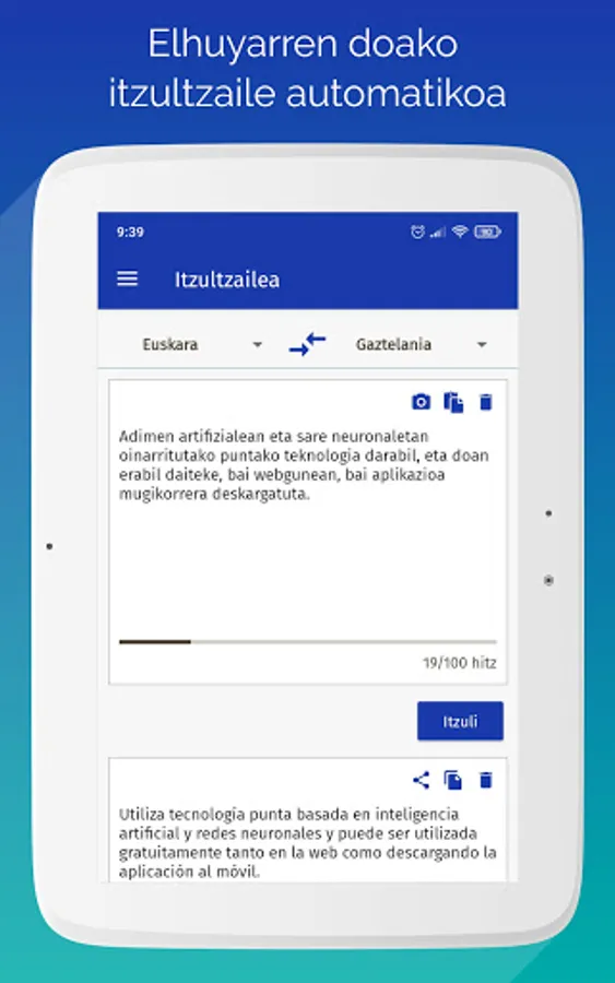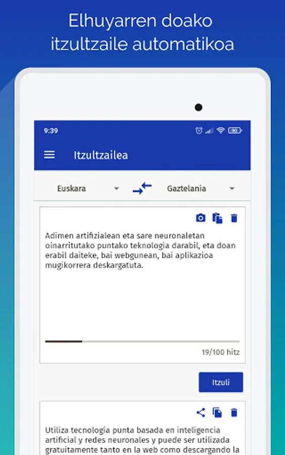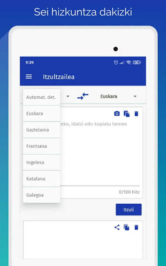This application corresponds to Elhuyar's automatic translator. It uses state-of-the-art technology based on artificial intelligence and neural networks, and can be downloaded for free. He speaks six languages: Basque, Spanish, French, English, Catalan and Galician. And it can be used for translations between any of these languages.