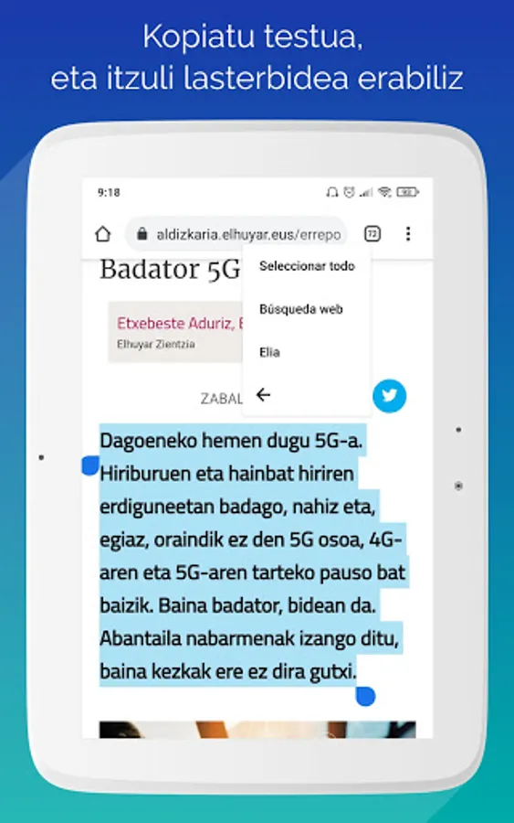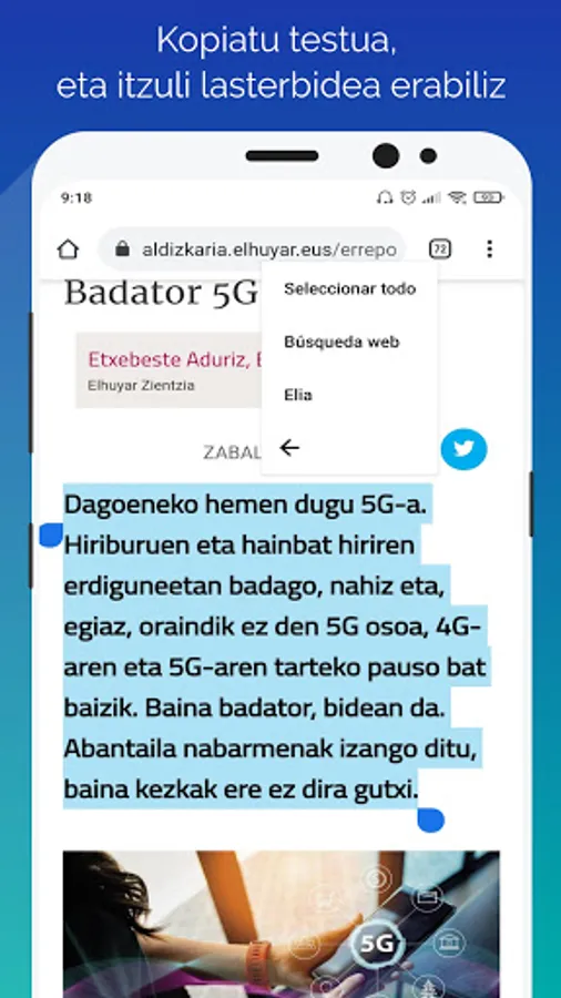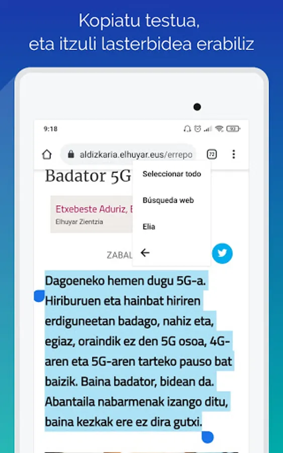 By downloading this application to your mobile phone, we can use it to translate any text we are reading. All you have to do is type in the text in the application, choose the language you want to translate it in and click on the "Translate" button. If we have the Elia app shortcut active, we don't have to type text in the app. On your mobile, outside of the Elia app, when we are reading anything, select the text, press the copy button, and the Elia app icon will appear. Clicking on it will take us directly to the application, and the text we have copied will appear in the corresponding text box.