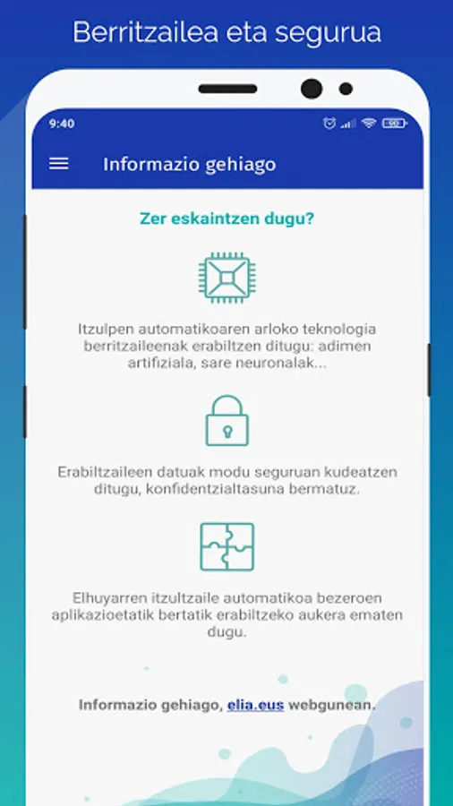 In addition to the application, Eli also has a website: elia.eus. On this website, you will find the same functionality as the application. As well as information on the advanced services offered by Elhuyar using Eli's technology.